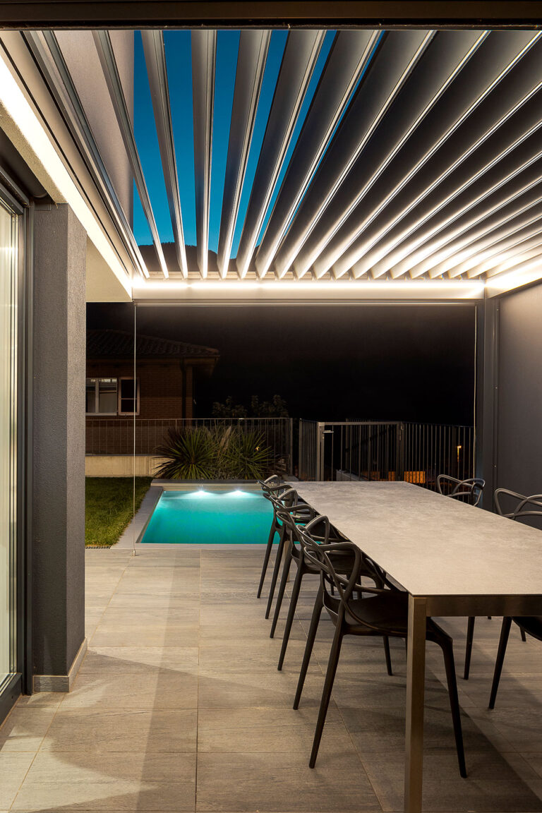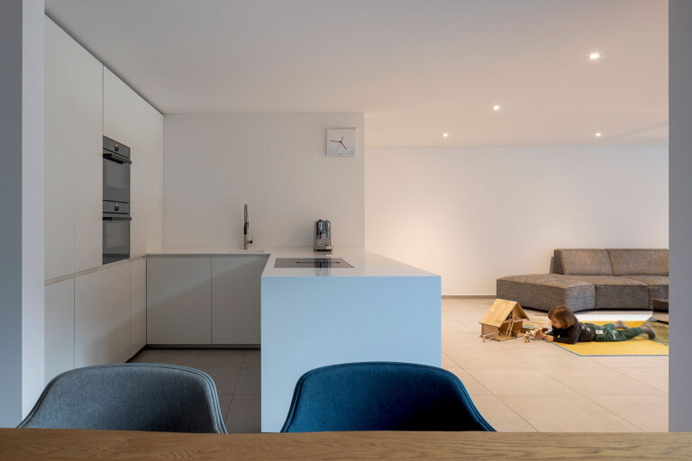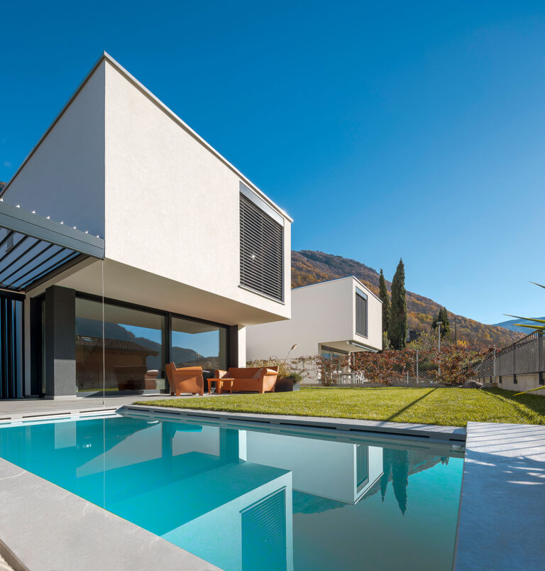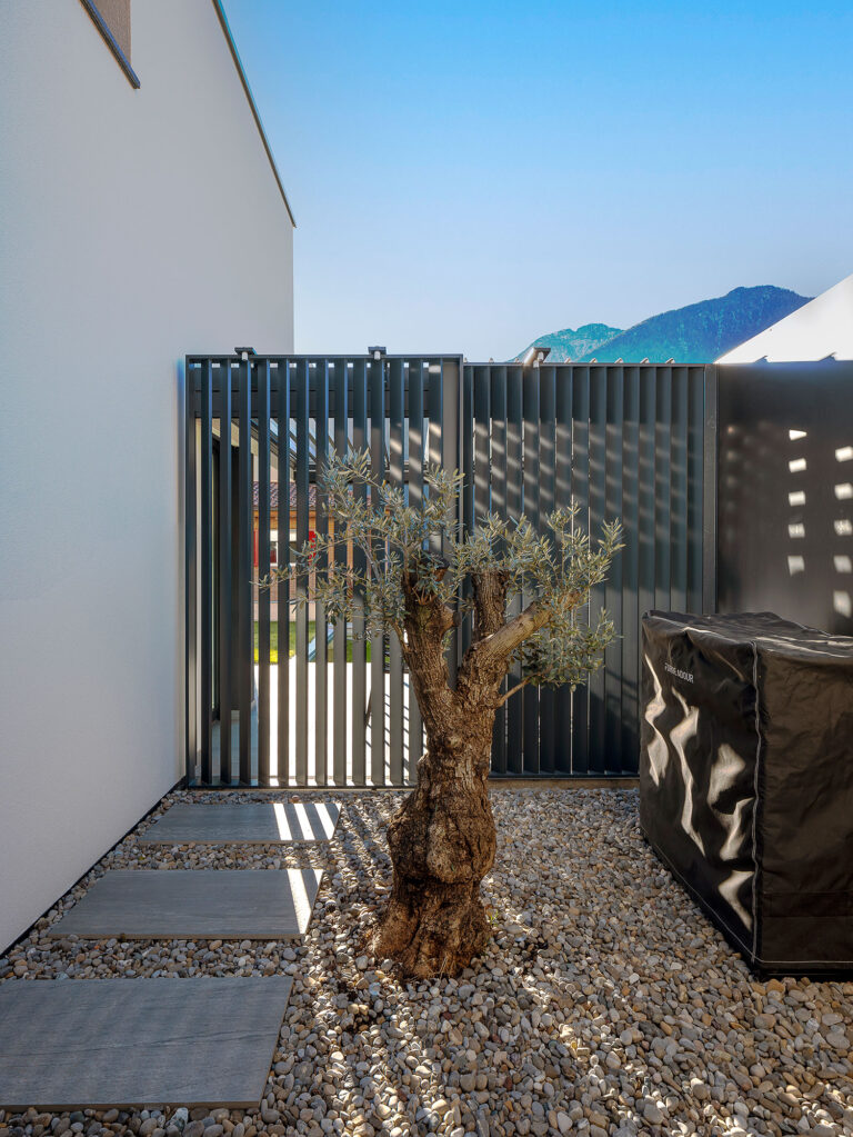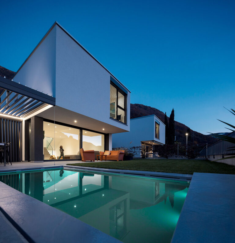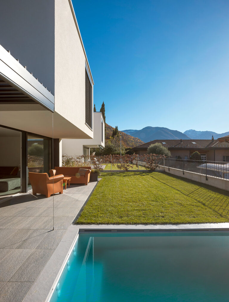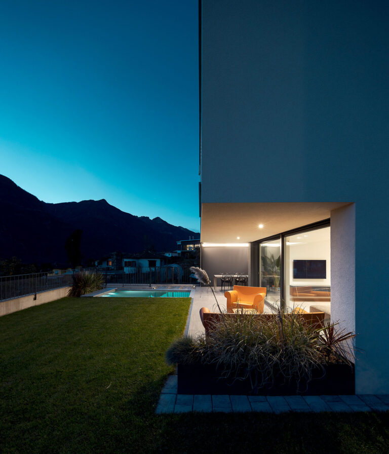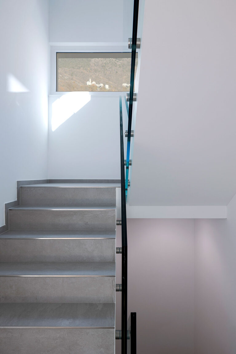 The land is sloping and the only possible vehicular access is from the valley. A concrete plinth houses within it the covered parking spaces, the main entrance and the technical rooms. This large plinth has the function of breaking up the slope of the land as much as possible, ensuring that a flat garden space is created and related to the living area, which occupies the middle level. The living area is developed in the highest level.