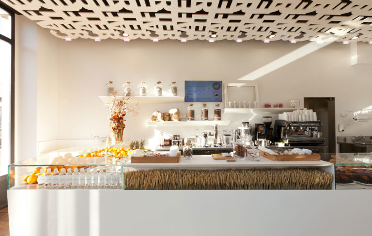 In order to hide the mechanical area and tubes, we designed a suspended ceiling using laser-cut polystyrene. The roof above is painted a very dark grey so the lightweight cut-out “cafe a porter”, ceiling appears to float above. It emphasises the height of the space while reinforcing the simple graphic design discreetly displayed in the cafe below.