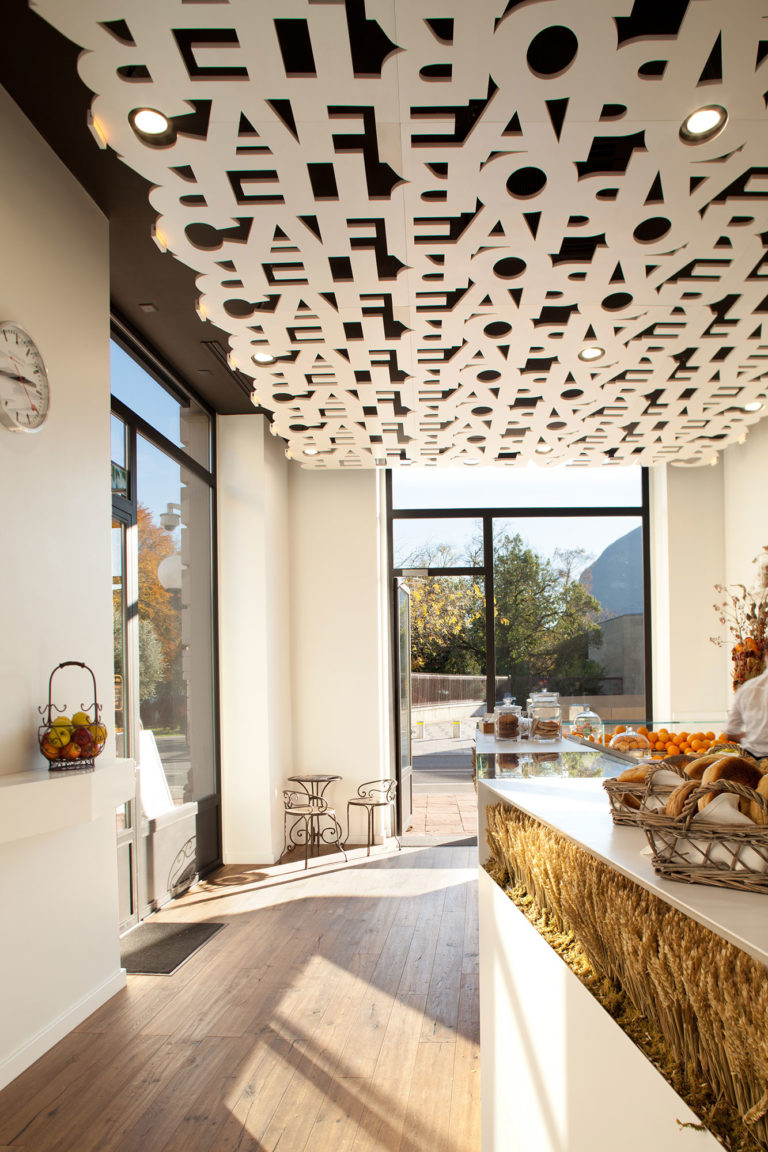 The existing building’s facade is a fine example of the city’s 19th century architecture with elegant and decorative stonework. This idea of ornament has been reintroduced to the cafe via its new ceiling. However, rather than the opulent celiings often seen in that epoch, this is a contemporary interpretation, echoing the past.