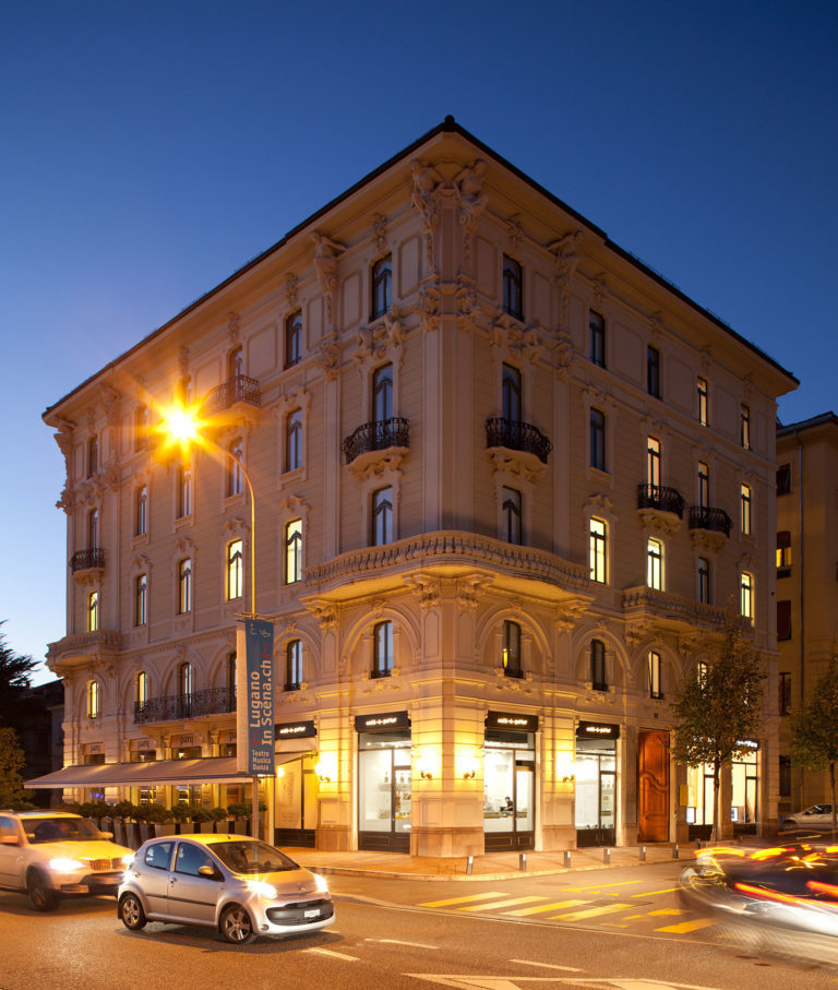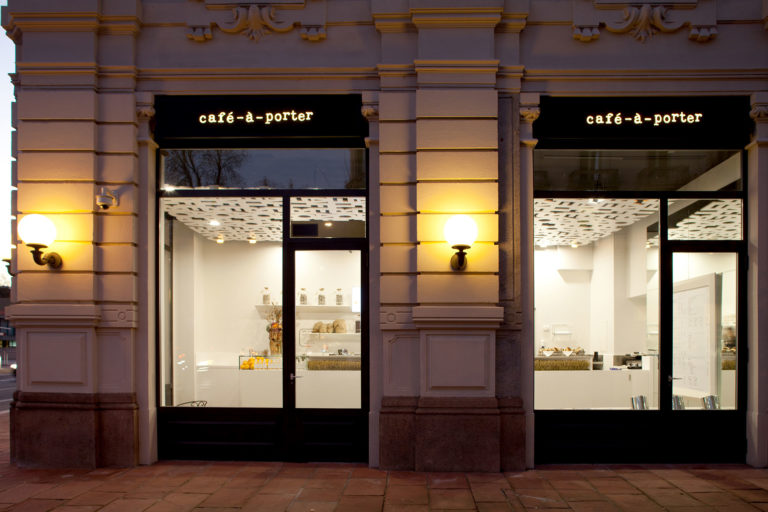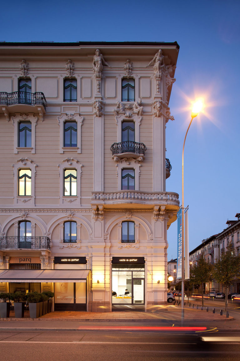Café-à-porter is a boutique takeaway coffee and pastry shop in the heart of Lugano, Switzerland. It is located on the ground floor of one of the city’s elegant 19th century “noble palace “, once grand homes lining the boulevard facing the lake. The cafe is directly opposite the entrance to Parco Ciani, the city’s beautiful lakeside park.