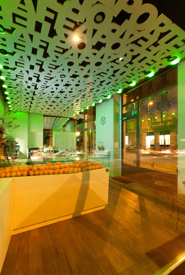 The cafe, busy with customers coming and going throughout the day, animates this street corner too at night. In the evening it is lit from within like the night sky with colored led lights, changing from blue to green to purple and pink.