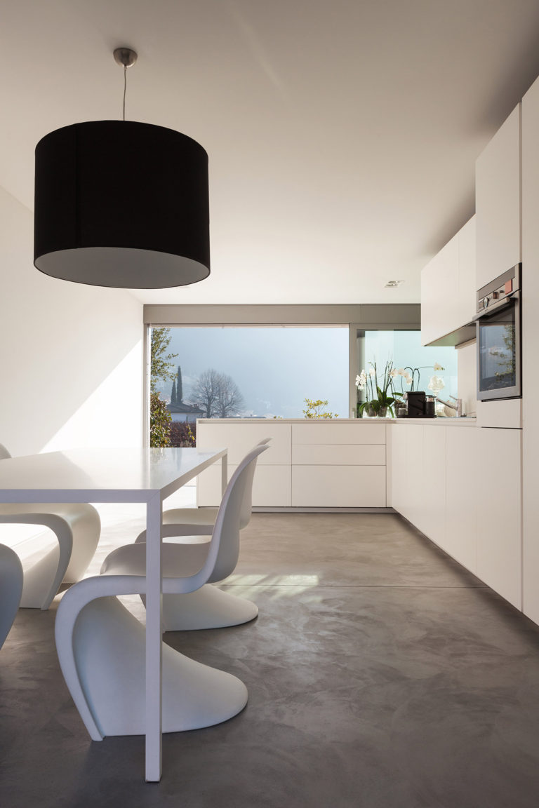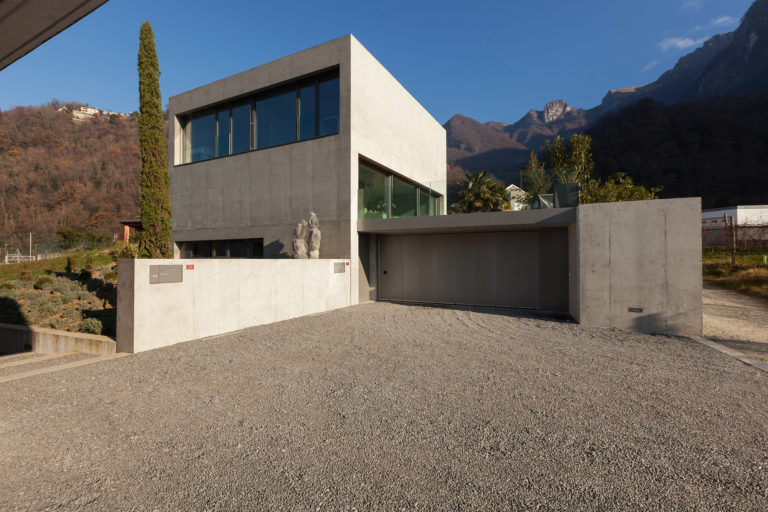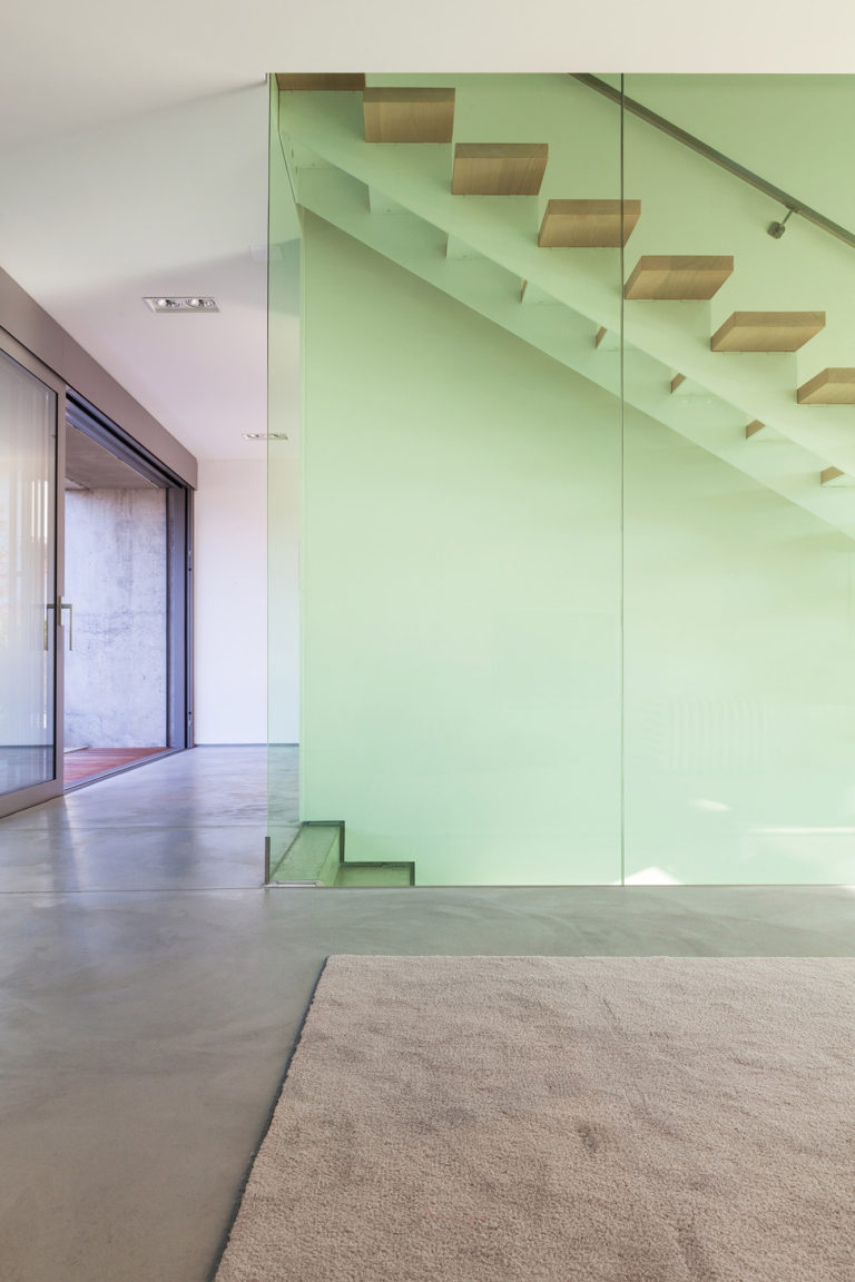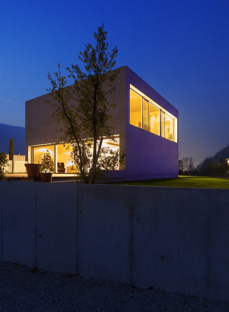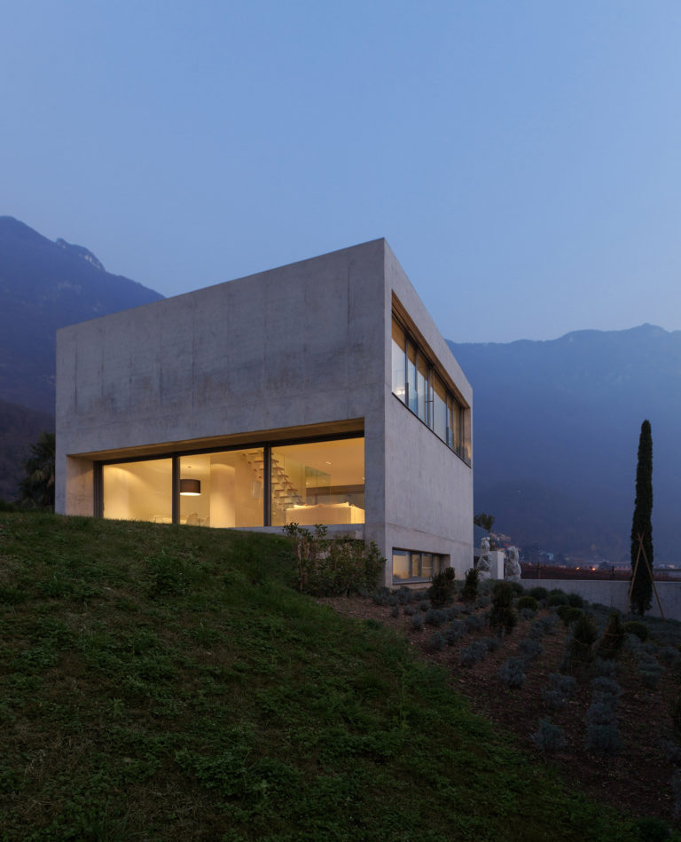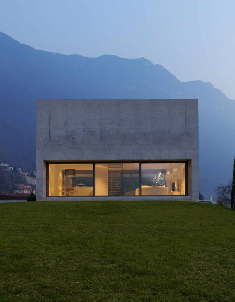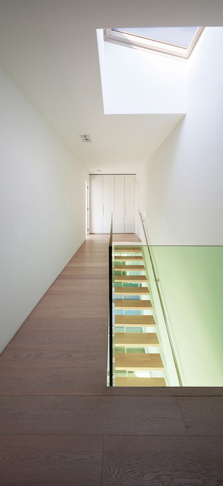On the ground floor two large windows open the kitchen and the living room on the surrounding landscape of the vineyards and on a large terrace that separates the house from the street. On the first floor the openings are rotated 90 ° from the ground floor to enjoy the lake view; inside a hallway connects the various rooms and a skylight opens the view of the mountains.