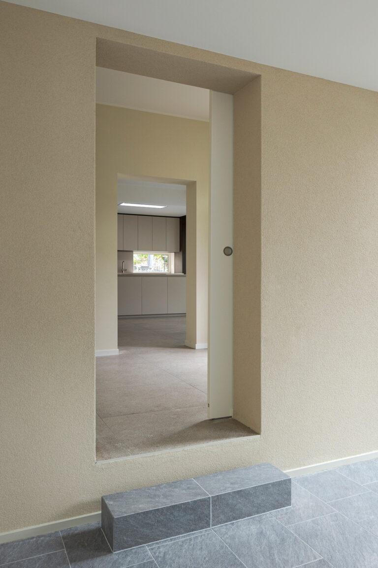Il progetto rispetta l’edificio esistente. La nuova architettura precisa il perimetro dell’edifico abbracciando la casa esistente, in questo modo ridefinisce, filtrato, il rapporto fra spazi interni ed esterni.