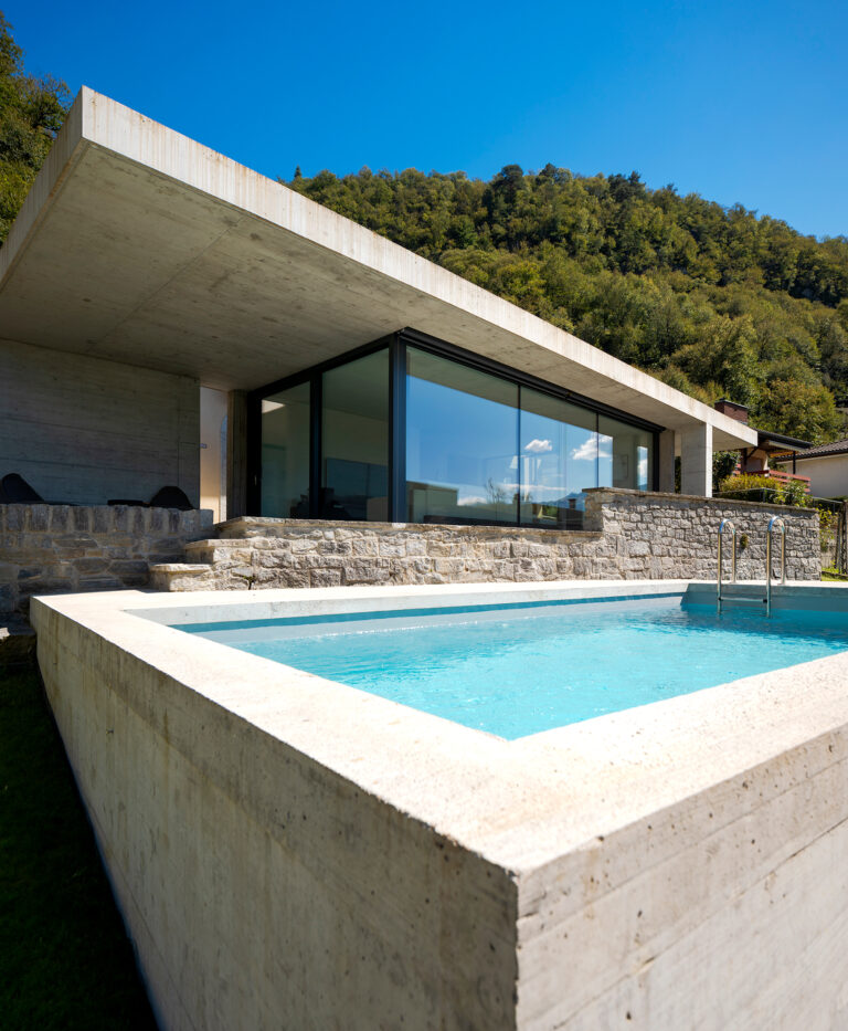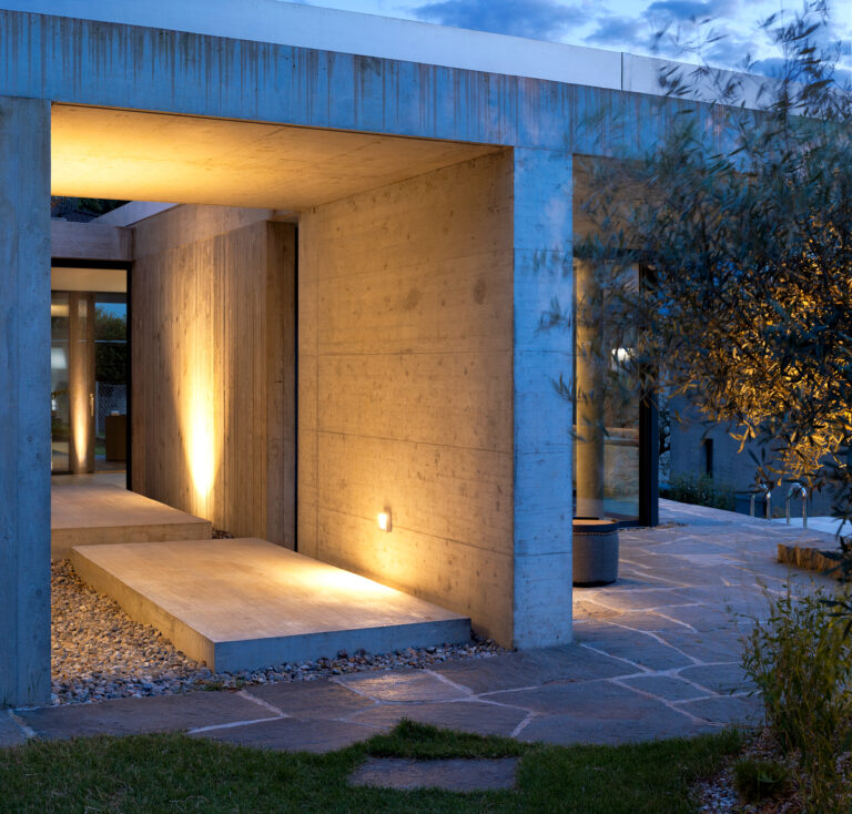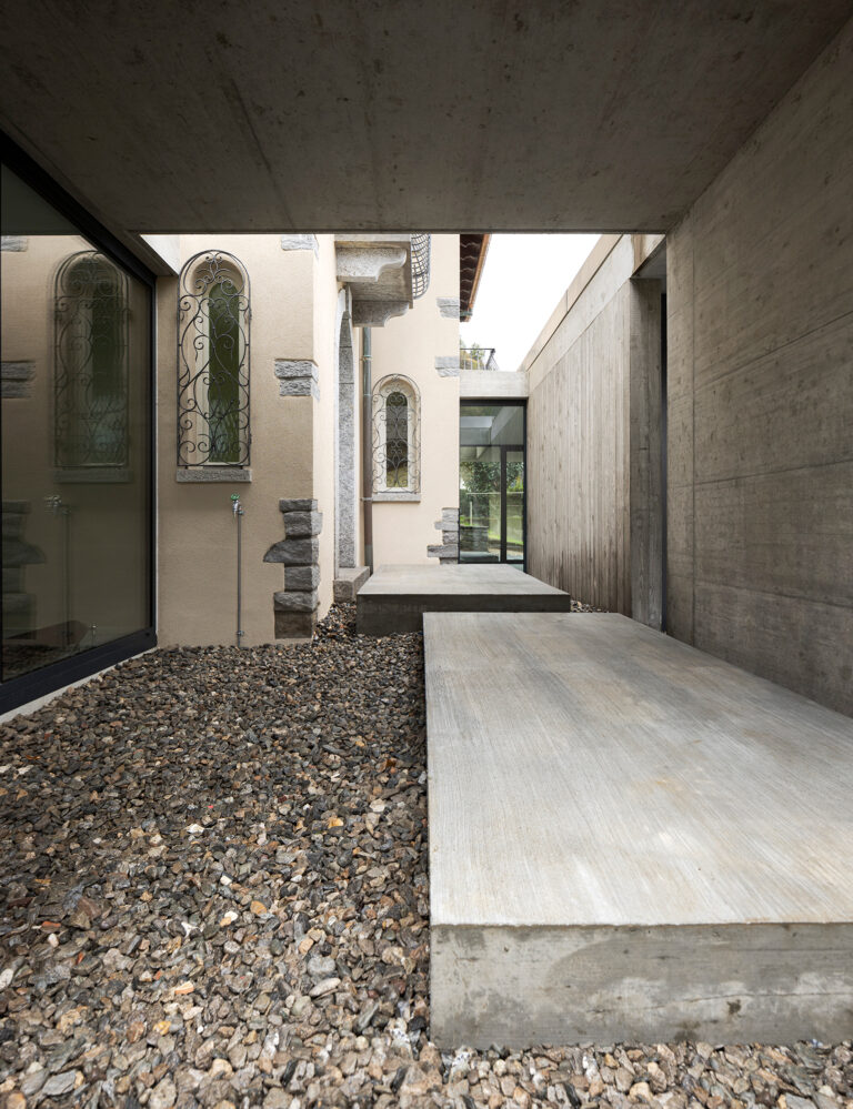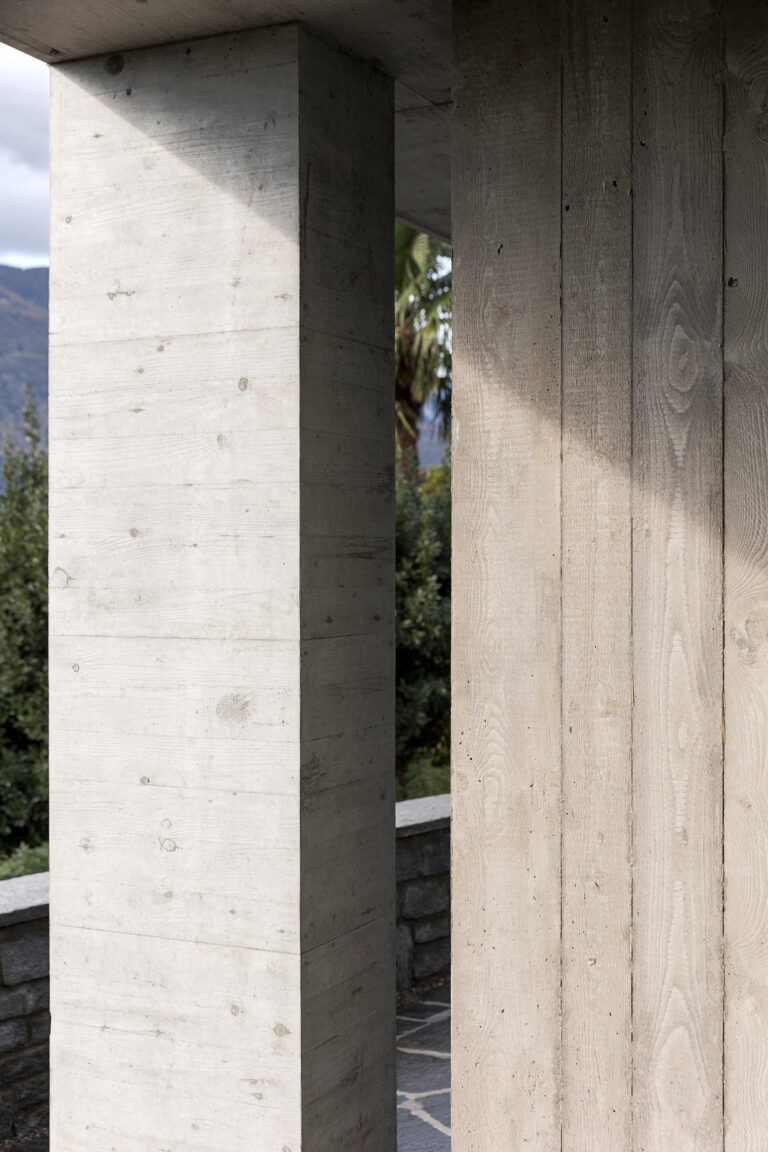 Le architetture trasparenti sono simultaneamente sottese da un piano in beton faccia a vista – sostenuto da lame fra loro ortogonali – che le protegge, unificando il progetto in un solo gesto e generando allo stesso tempo una serie di nuovi spazi esterni coperti e scoperti con differenti funzioni: ingresso, portico, pranzo estivo e zone di accesso alla piscina e alla nuova tettoia dei posteggi.