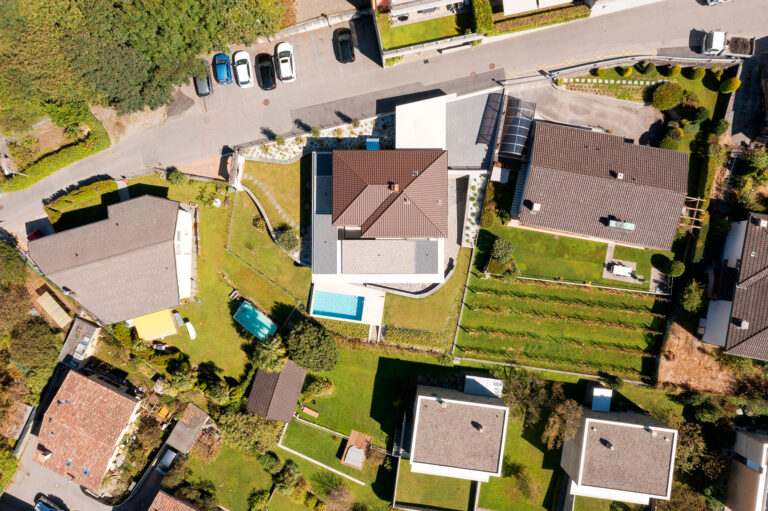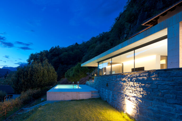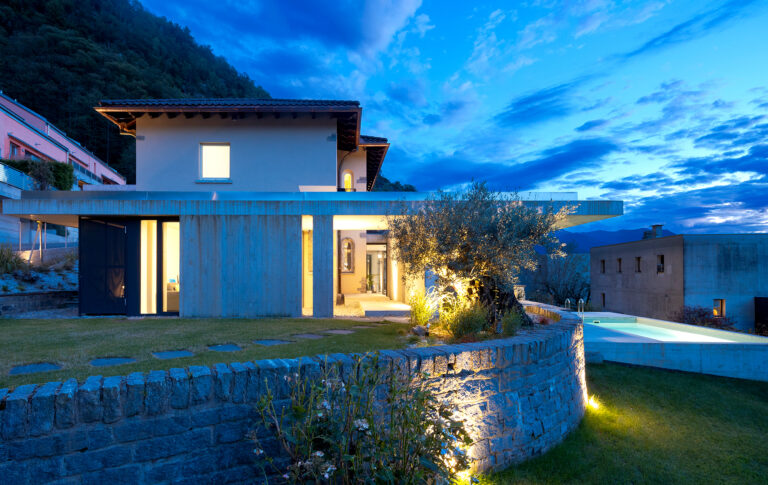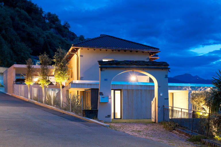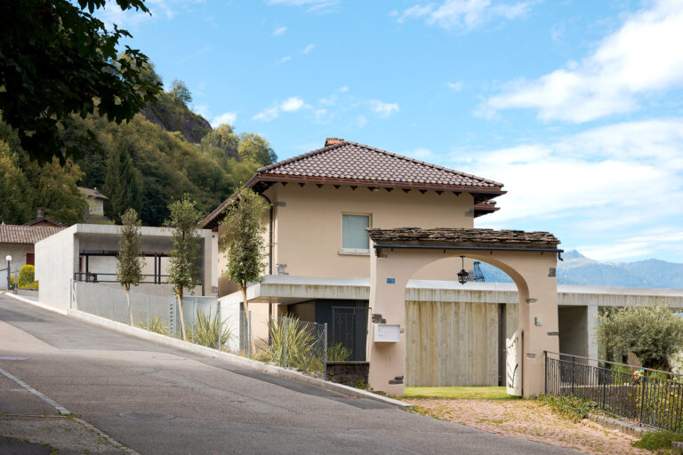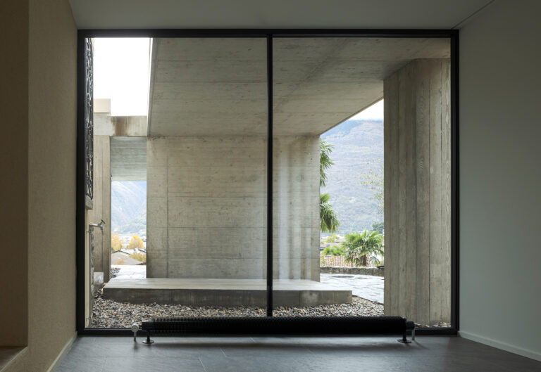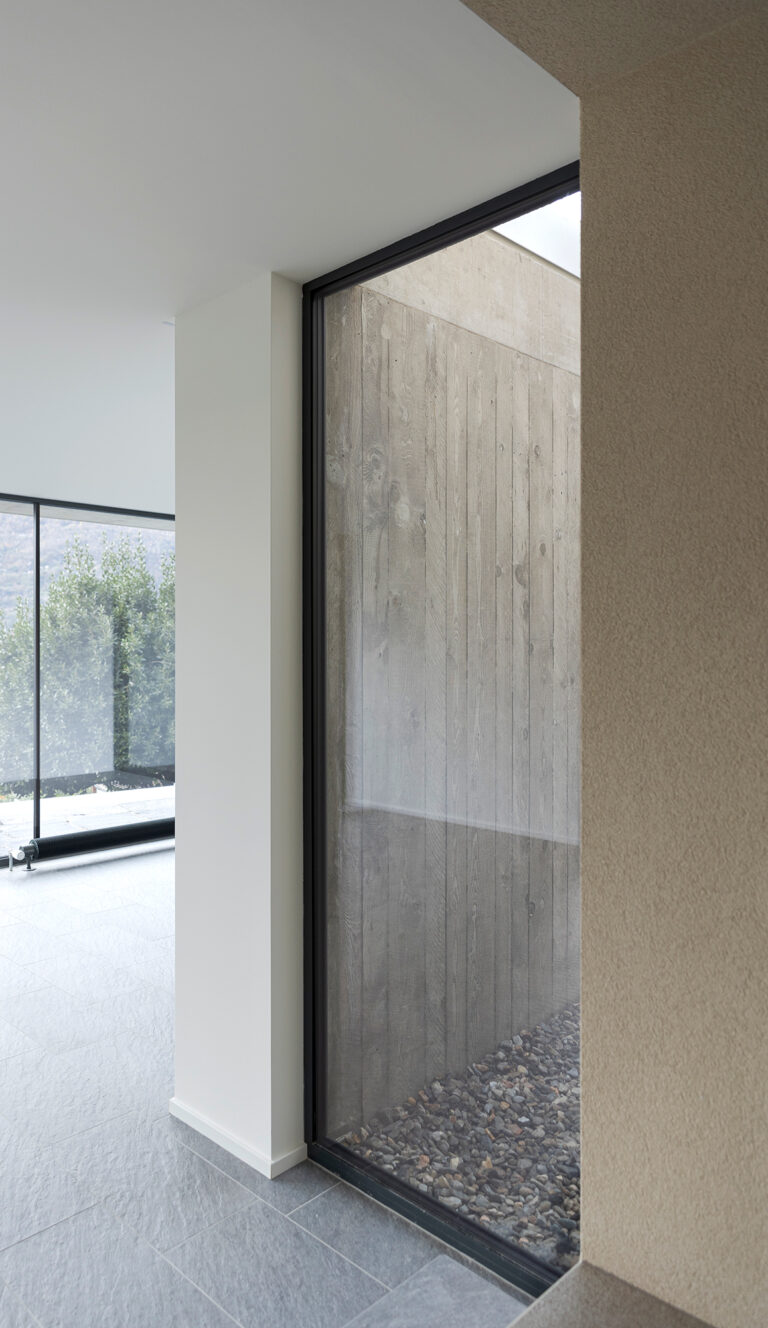 Le architetture trasparenti sono simultaneamente sottese da un piano in beton faccia a vista – sostenuto da lame fra loro ortogonali – che le protegge, unificando il progetto in un solo gesto e generando allo stesso tempo una serie di nuovi spazi esterni coperti e scoperti con differenti funzioni: ingresso, portico, pranzo estivo e zone di accesso alla piscina e alla nuova tettoia dei posteggi.