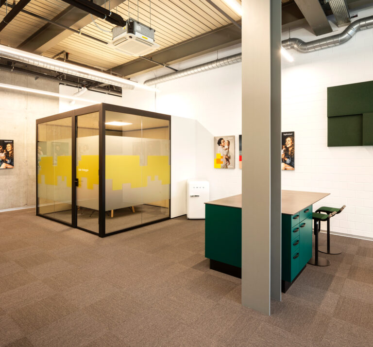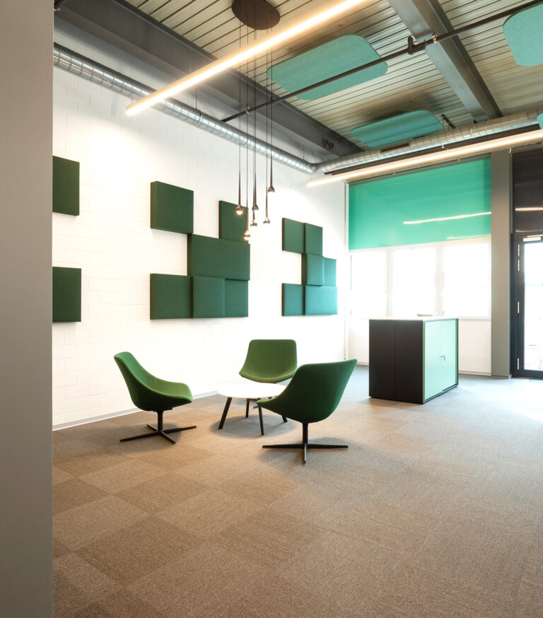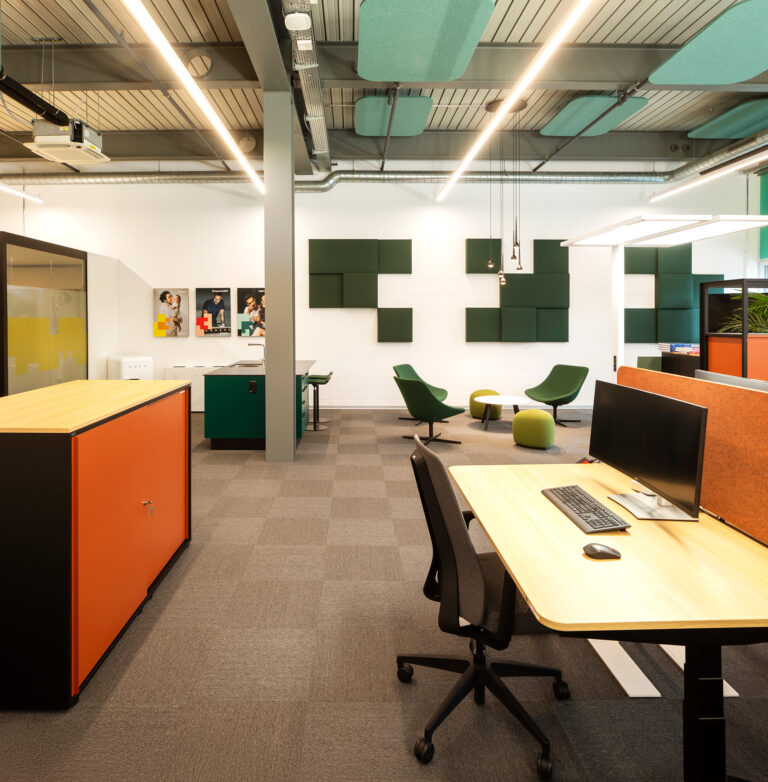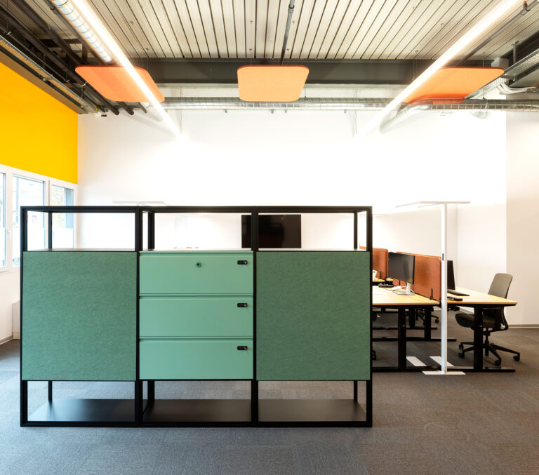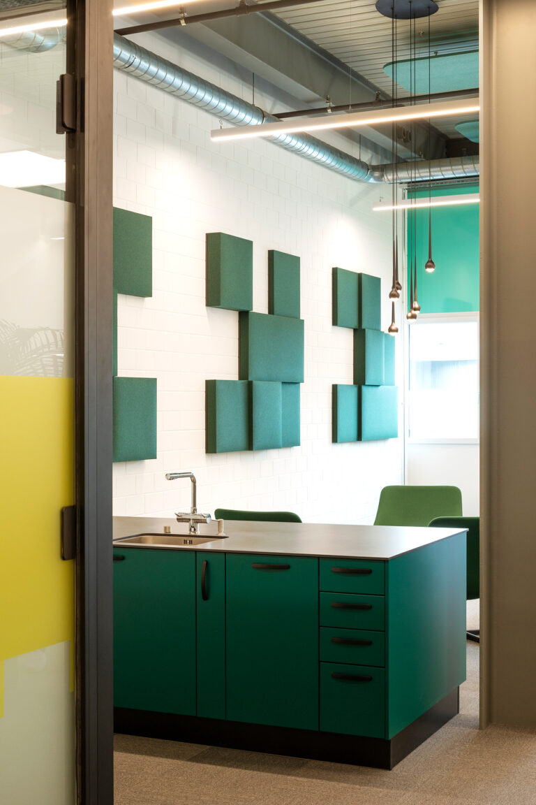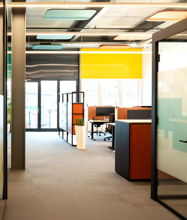 Lo spazio di lavoro luminoso, gli arredi colorati e il design ricercato conferiscono agli uffici un carattere gradevole e sofisticato. Il cliente viene quindi accolto in un ambiente dinamico, mentre ai dipendenti è riservato una spazio di lavoro confortevole.