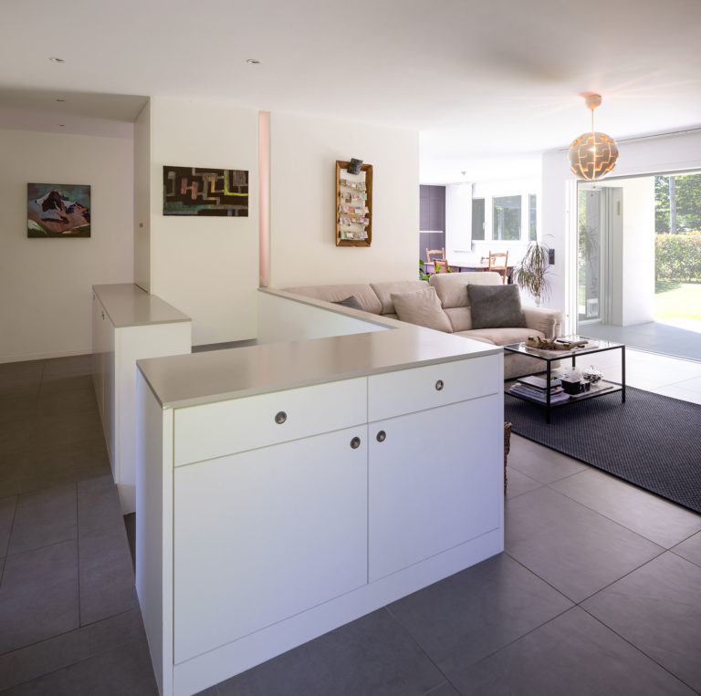 Dall’entrata, voluta giustamente a questo piano sebbene nascosta dalla strada, si ha una prospettiva trasversale di tutta la casa, da un lato verso il tavolo da pranzo, attraverso il soggiorno, e dall’altro anche verso la parte più intima e riservata.