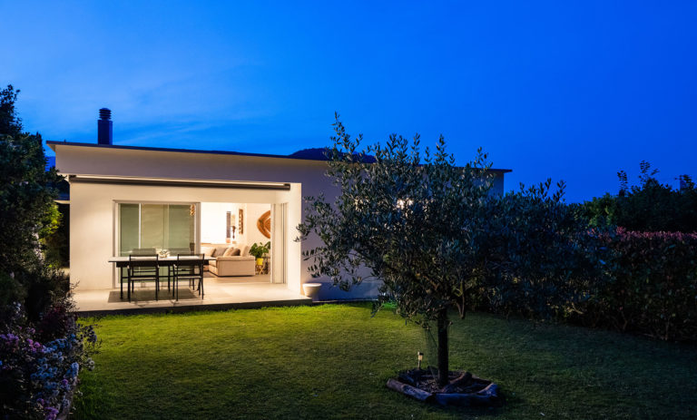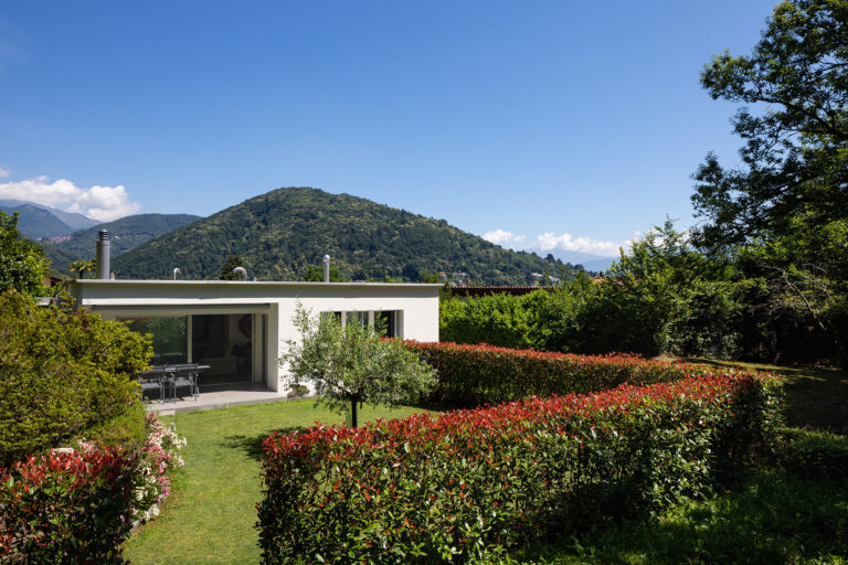 Ho scelto quindi di edificare gli spazi abitabili su un solo piano, a livello del giardino, appoggiandolo su un basamento seminterrato contenente le autorimesse, a livello della strada.