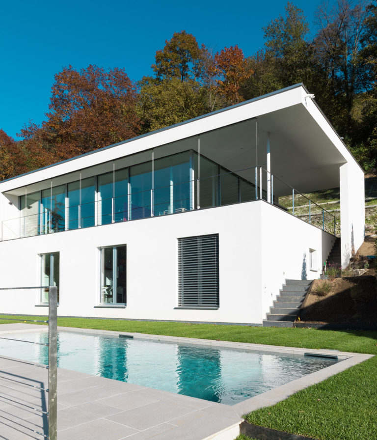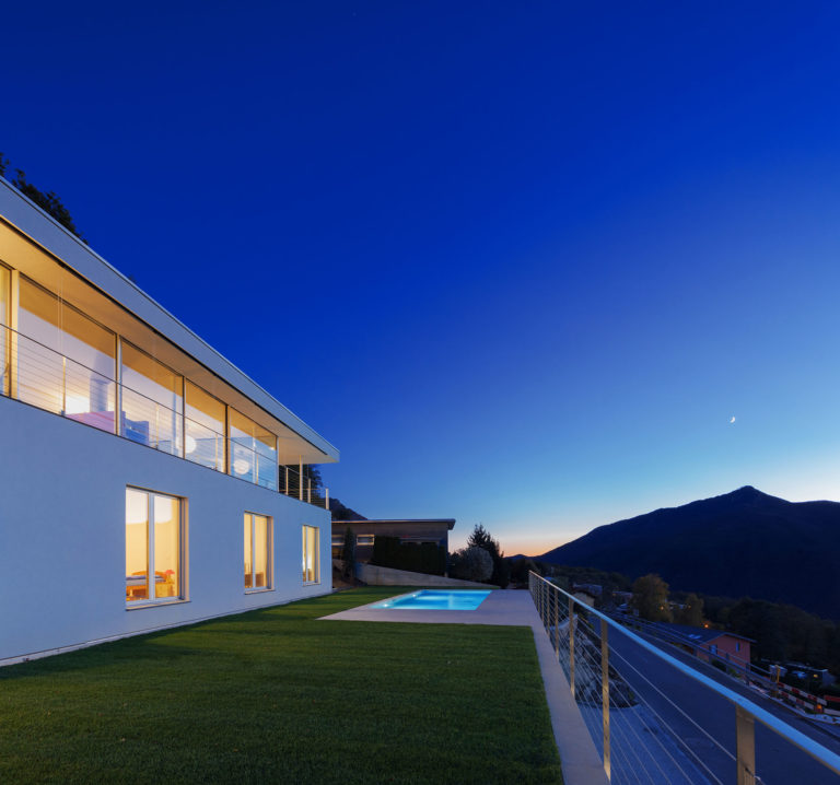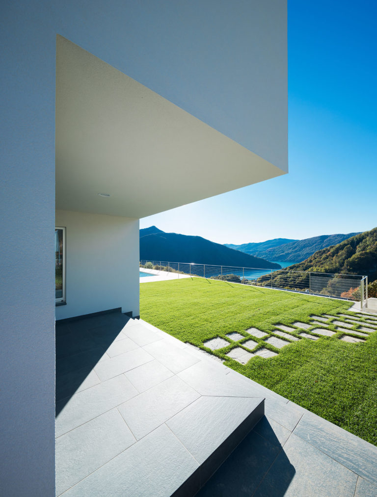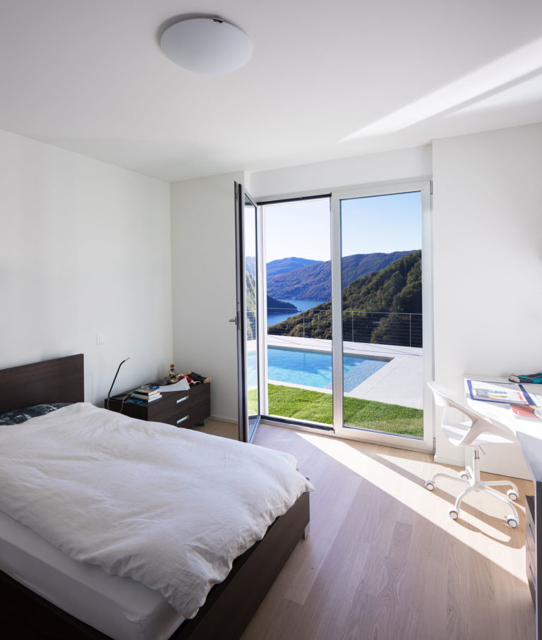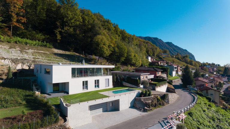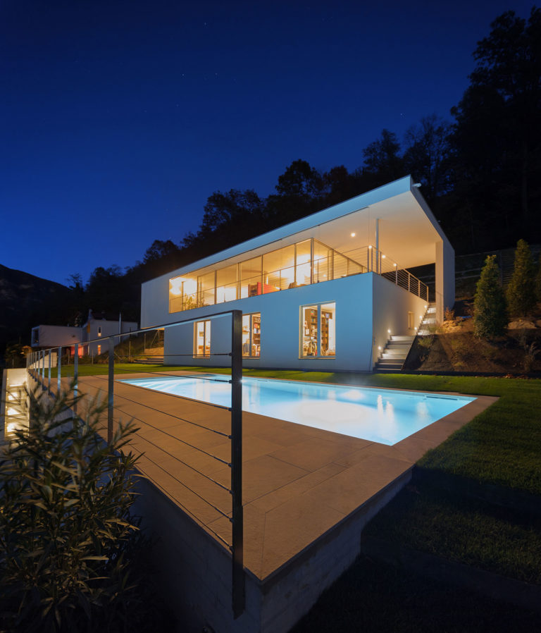 Il giardino inferiore, sopraelevato di un piano rispetto alla strada, si stacca dal luogo pubblico e acquisisce così più privatezza. Gli spazi interni dotati di grandi vetrate, si affacciano sul paesaggio mozzafiato come a voler confrontare l’uomo con l’infinito. Si creano momenti magici dove l’acqua cristallina della piscina sfiora lo specchio d’acqua del lago Ceresio.