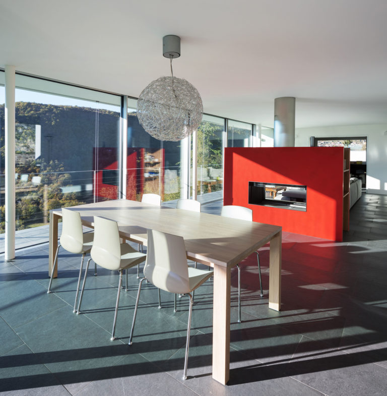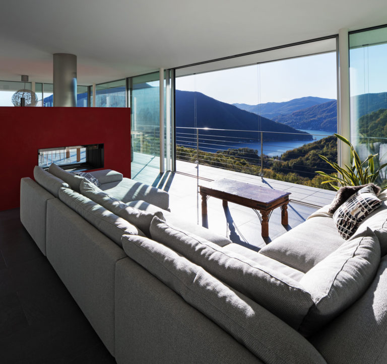Dal soggiorno sicuro e tranquillo, si gode senza barriere dello spettacolo sempre diverso e magnifico della fluttuazione della luce secondo le condizioni meteorologiche e il passare del tempo. La lunga vetrata a tutt’altezza nega il limite tra interno ed esterno e riporta il paesaggio nel salotto.