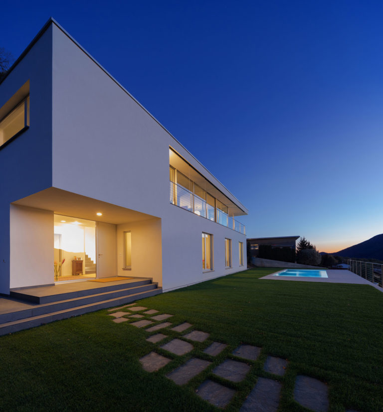 La volumetria essenziale dell’edificio, accentuata dal colore bianco, viene arricchita da spazi scavati che apportano profondità e dinamicità alla facciata in due momenti significativi del progetto. Una delle concavità forma un portico che permette di entrare in casa al piano terreno, mentre la terrazza coperta al primo piano modella un grande vuoto protetto, percorso da una scala esterna che mette in relazione i giardini inferiore e superiore, il lago lontano e il monte attiguo, l’esterno e l’interno.