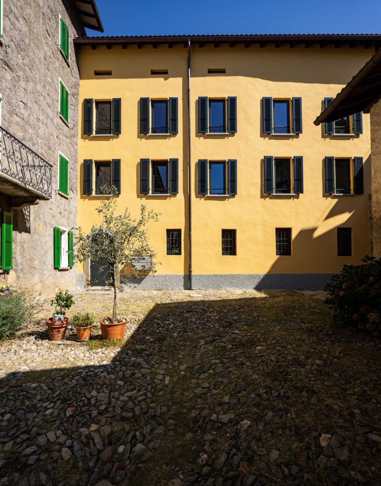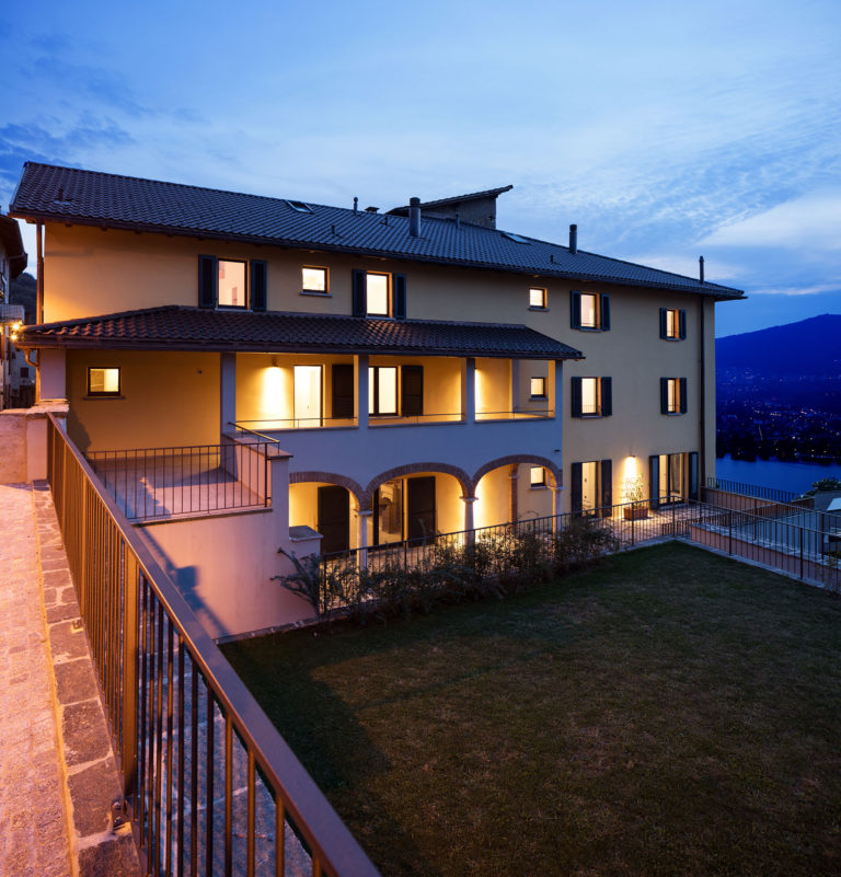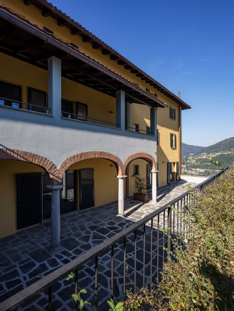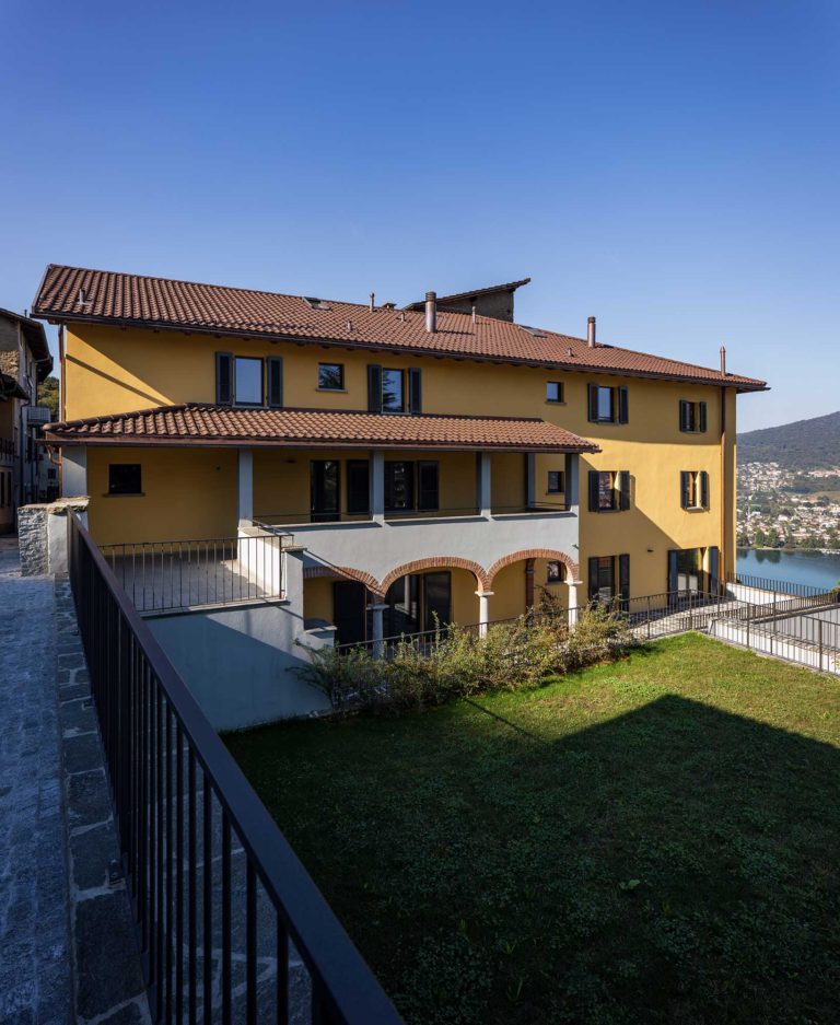 L’ingresso della Villa è stato mantenuto sul fronte Sud per valorizzare la piazzetta del Nucleo, quale centro di scambio e interazione tra gli abitanti. All’interno della Villa sono quindi stati creati quattro appartamenti duplex con affacci sul Nucleo e sul parco, due dei quali possono inoltre avvalersi della vista sul Lago. In aggiunta, con lo scopo di preservare il parco, si è scelto di nascondere i posteggi creando un’autorimessa interrata e accessibile mediante un montavetture posto nello stallino della Villa, ai margini del parco. La stradina pedonale posta sopra il muro in sasso del parco, assume le caratteristiche di una passeggiata panoramica di connessione tra il Nucleo e la zona residenziale più recente.