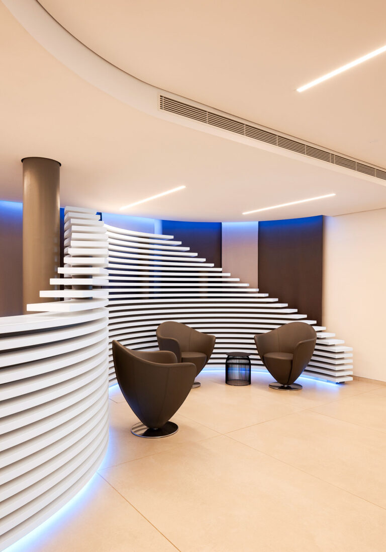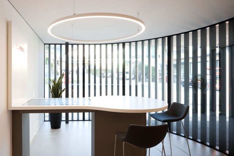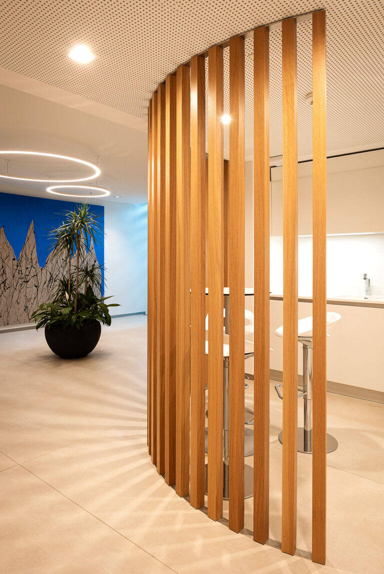 Interventi puntuali hanno permesso di ricavare quattro salottini di consulenza, l’ufficio di back office riservato ai collaboratori ed una nuova parete in doghe verticali di rovere che arreda lo spazio di arrivo al primo piano e separa l’area ristoro.