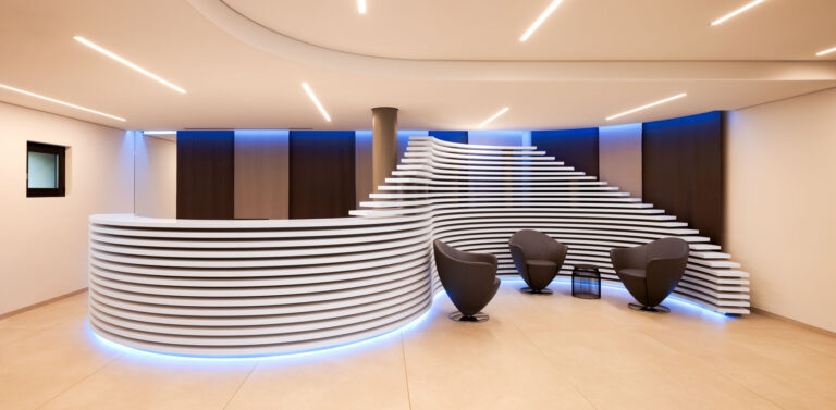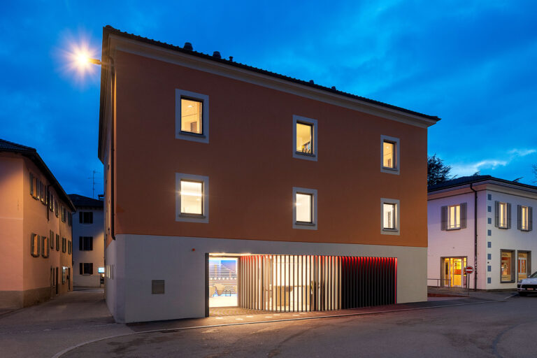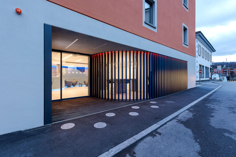 Questi obiettivi sono stati tradotti grazie ad un unico elemento di facciata che ha caratterizzato l’intero progetto di trasformazione, definendone il percorso e la nuova spazialità. Le doghe verticali metalliche coinvolgono tutta la facciata esterna, la caratterizzano e ne fanno l’elemento decorativo, accompagnando il fruitore lungo tutto il percorso che dall’esterno lo portano dapprima ad intuire ed in seguito scoprire gli ambienti interni. L’evidente curva in facciata, in contrapposizione alla massiccia muratura preesistente, ammorbidisce ed evidenzia l’accesso, definendo allo stesso tempo gli spazi interni.