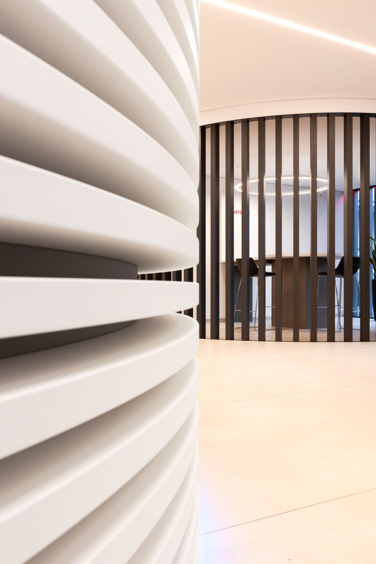 In sequenza troviamo nell’atrio d’ingresso il bancomat attivo 24h, superata la porta scorrevole alla nostra sinistra le due postazioni bancomat selfcash e davanti a noi un grande mobile definisce il welcome desk e la zona d’attesa per i clienti. Separato e definito dalla parete in doghe verticali metalliche è stato ricavato il salottino di consulenza breve che ospita uno schermo interattivo.
