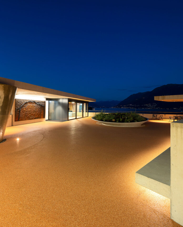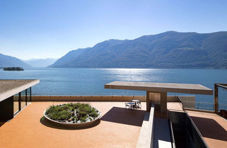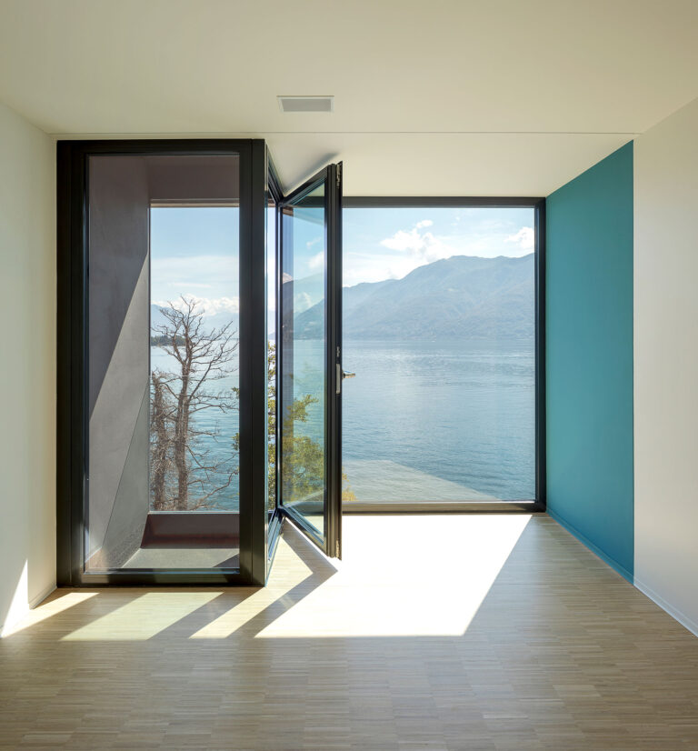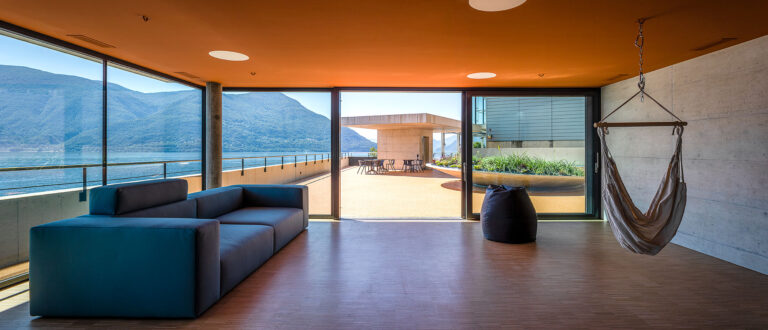 Il soggiorno, aperto sul lago e sulle isole di Brissago, è orientato verso la piazzetta ed il giardino. Una superficie vetrata apribile determina una soluzione di continuità fra interno ed esterno.