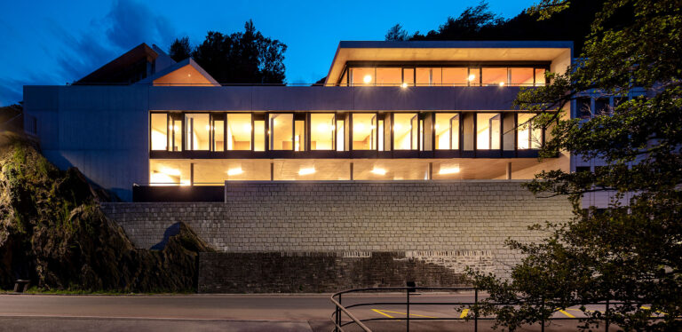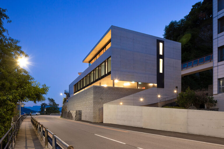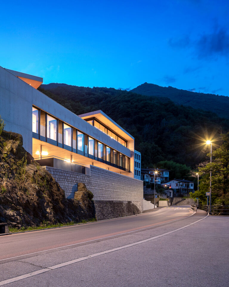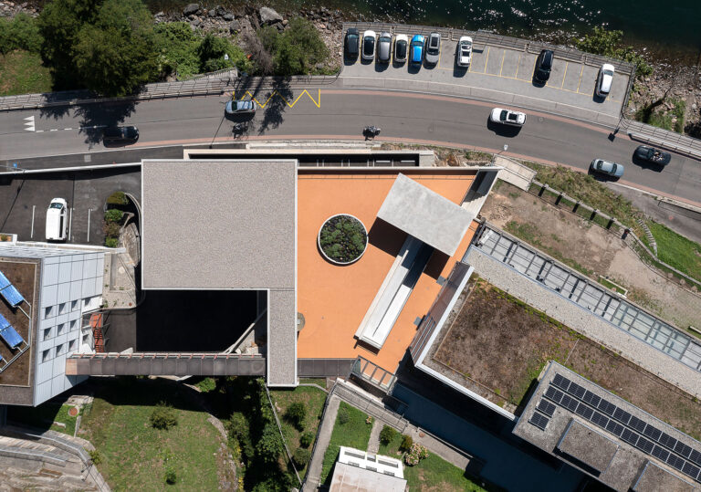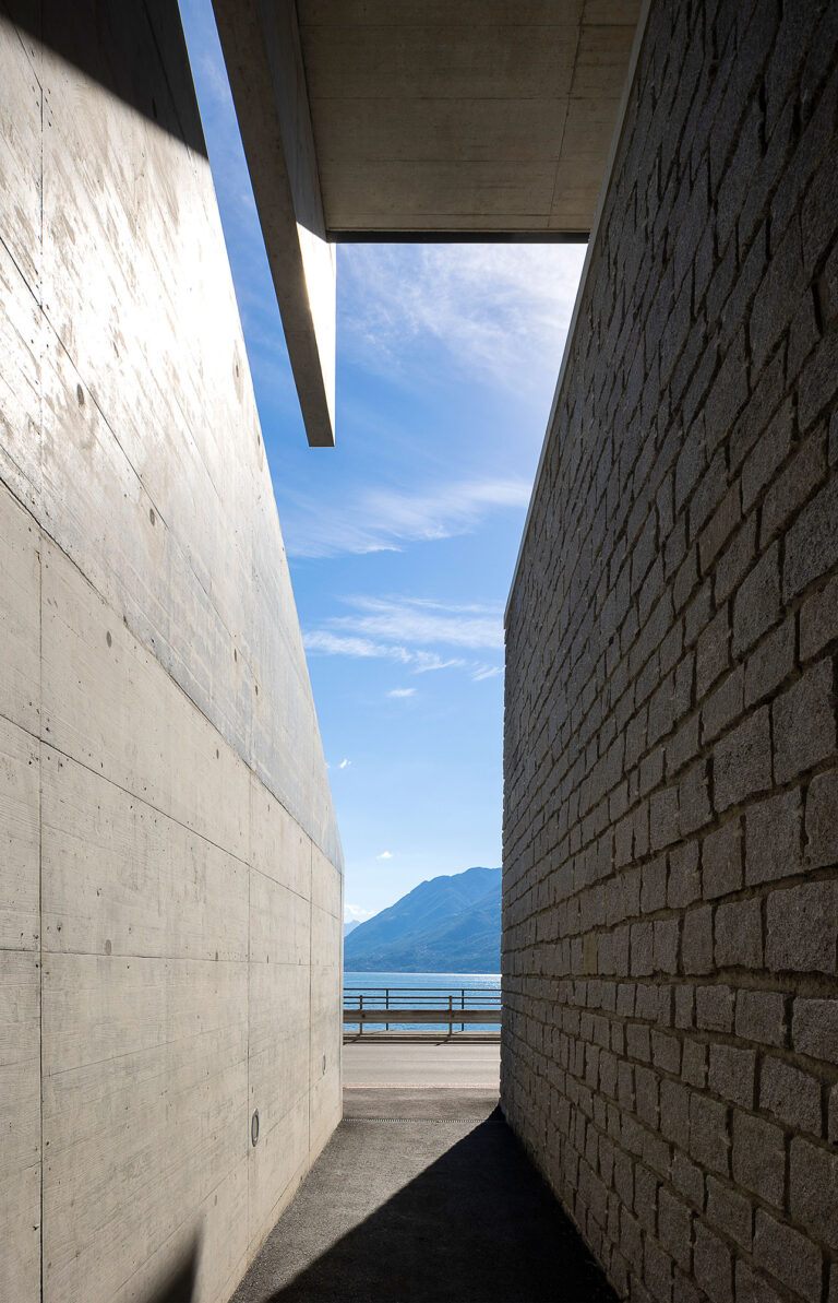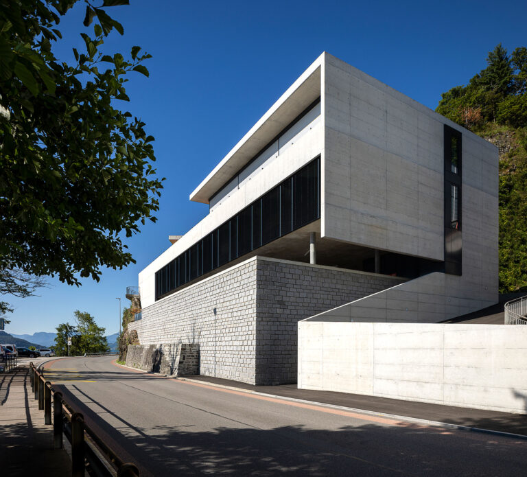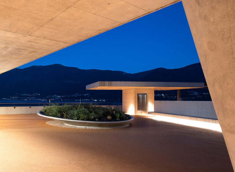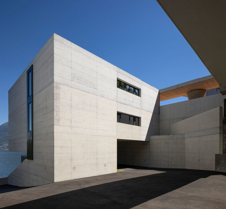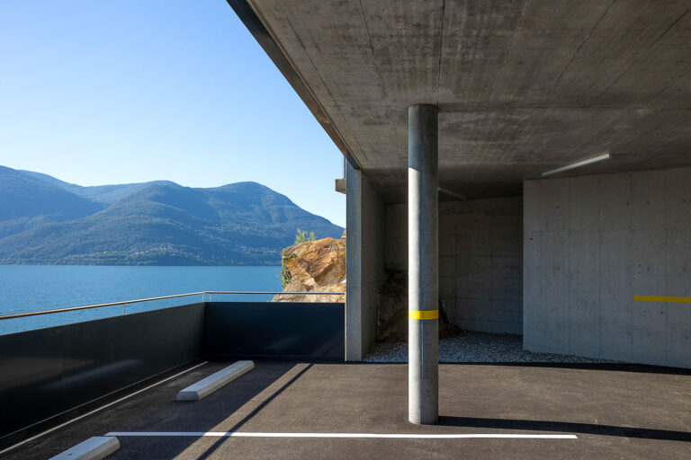 L’edificio si snoda intorno alla nuova superficie in piano, si insedia in posizione avanzata, verso il lago. La costruzione si sviluppa su due livelli principali: il primo ospita le camere ed i servizi ed è orientato verso il lago; il secondo ospita il soggiorno, l’atrio e la cucina e, pur mantenendo il rapporto visivo con il lago, si orienta verso sud ed il giardino.