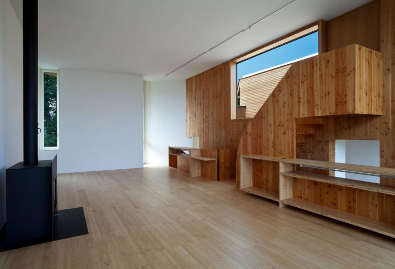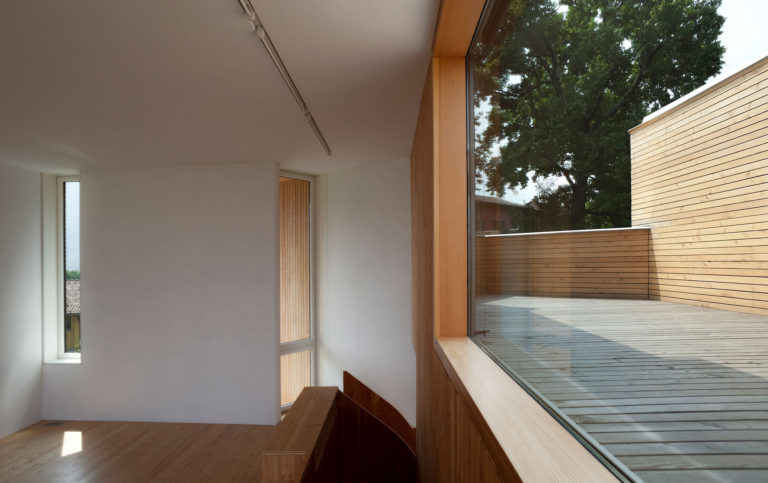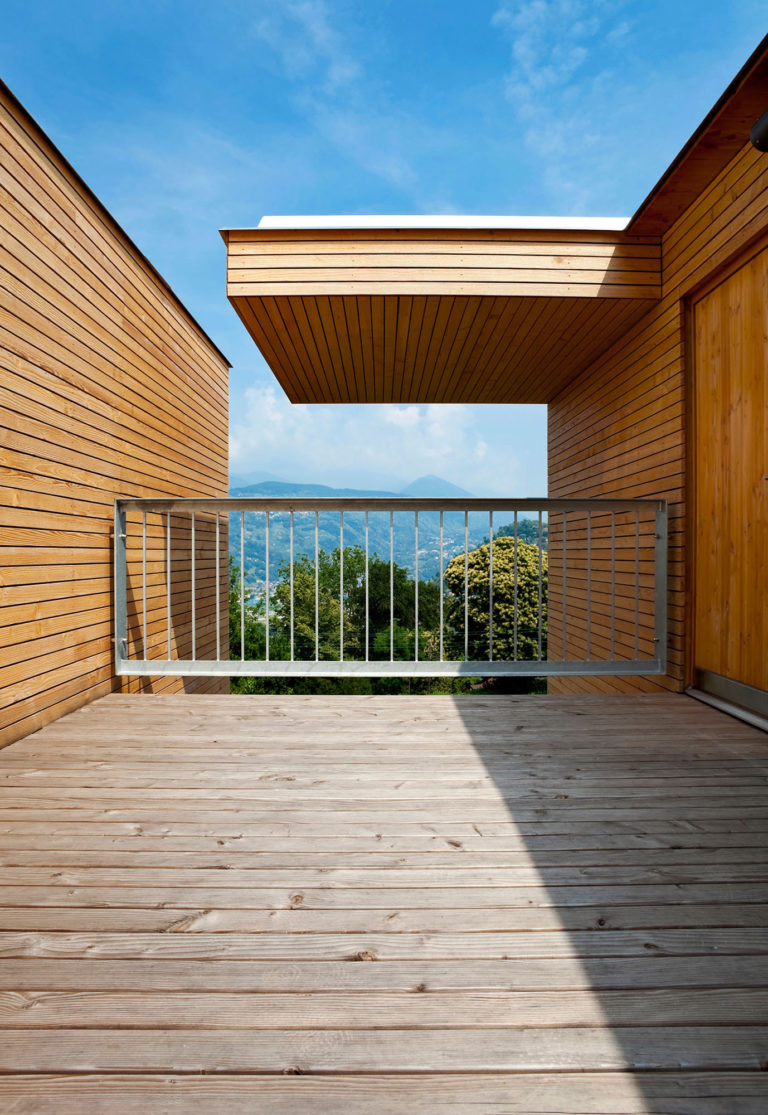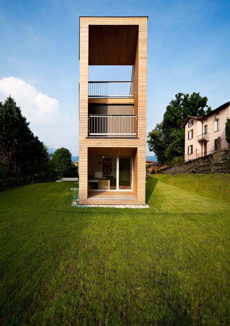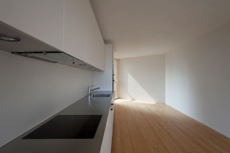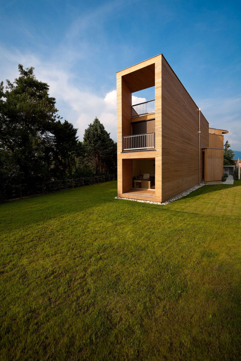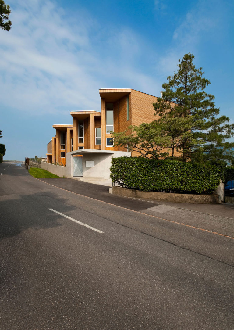 La forma stretta e lunga della parcella risulta determinante per la forma e la posizione dell’edificio, che mantiene su tutti i lati le distanze imposte dal Piano Regolatore. Gli appartamenti sono organizzati su due piani, con le camere al pian terreno e con la cucina e soggiorno al primo piano.