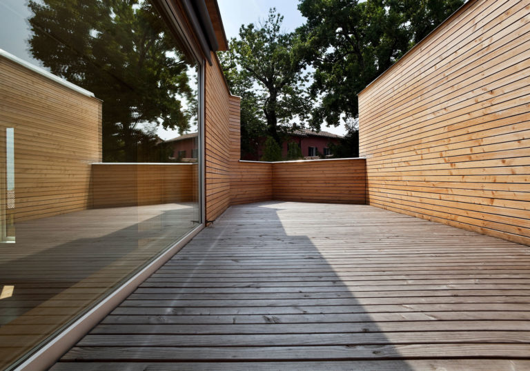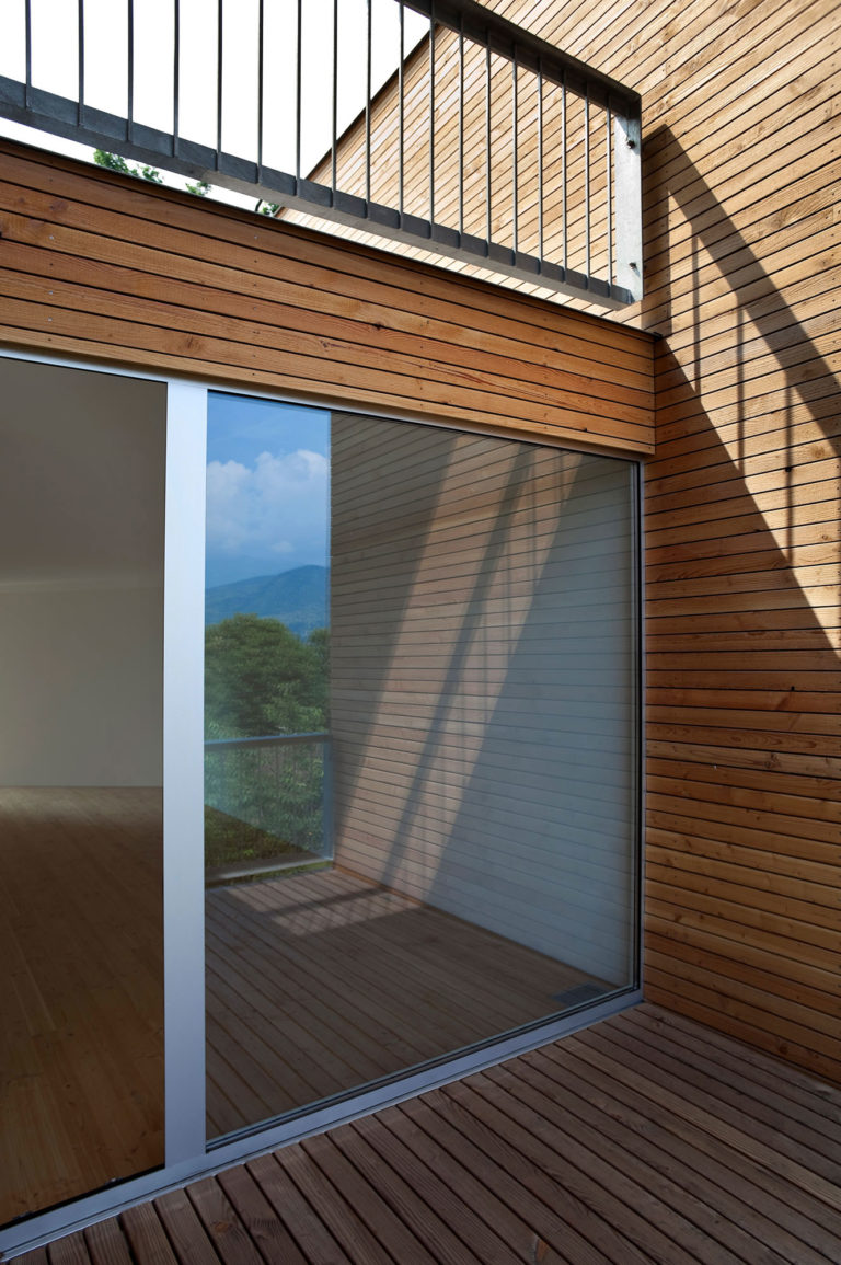 Il rivestimento è di listelli orizzontali in douglasie grezze. La casa è concepita secondo i criteri di basso consumo energetico MINERGIE.