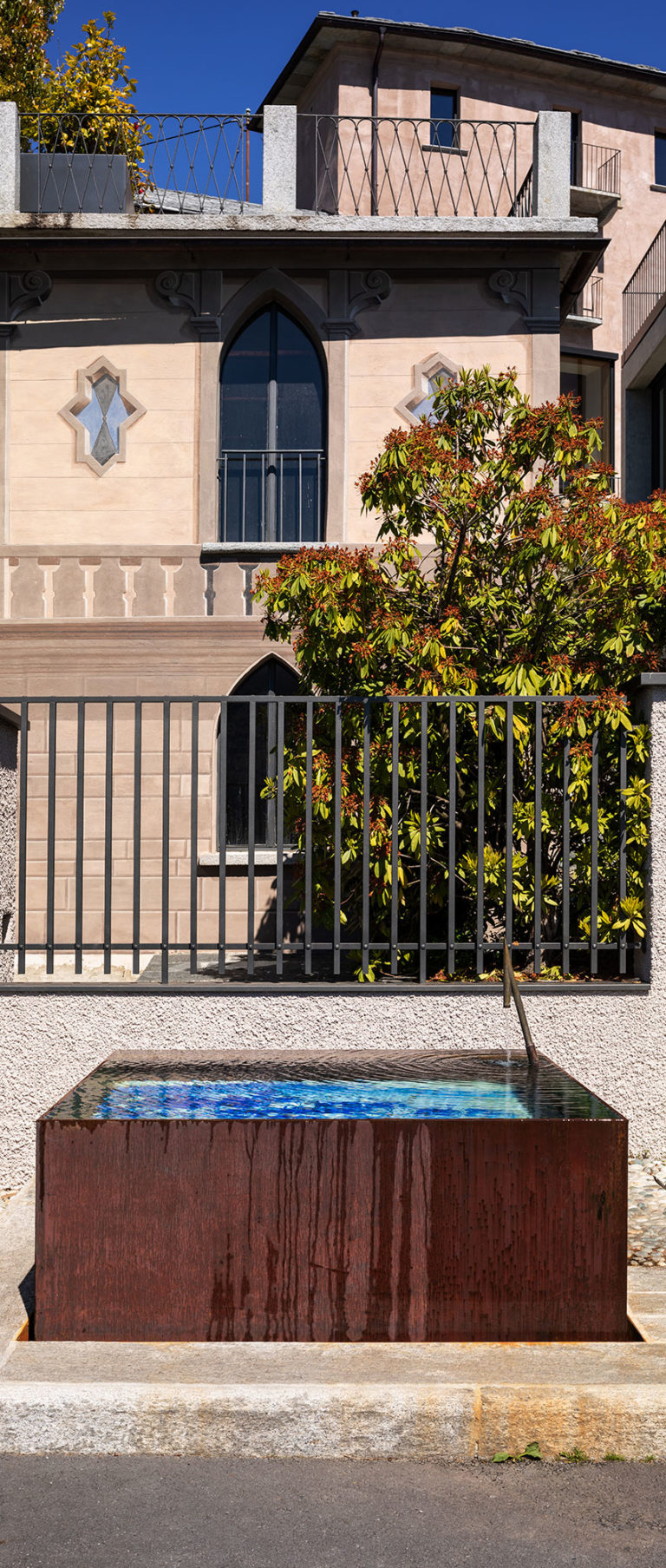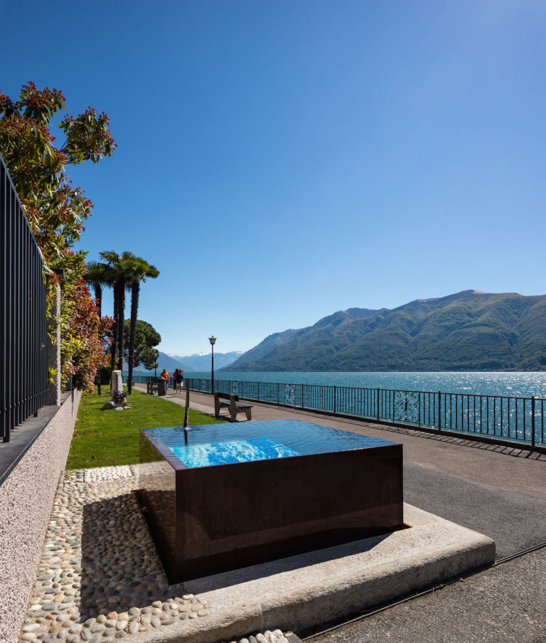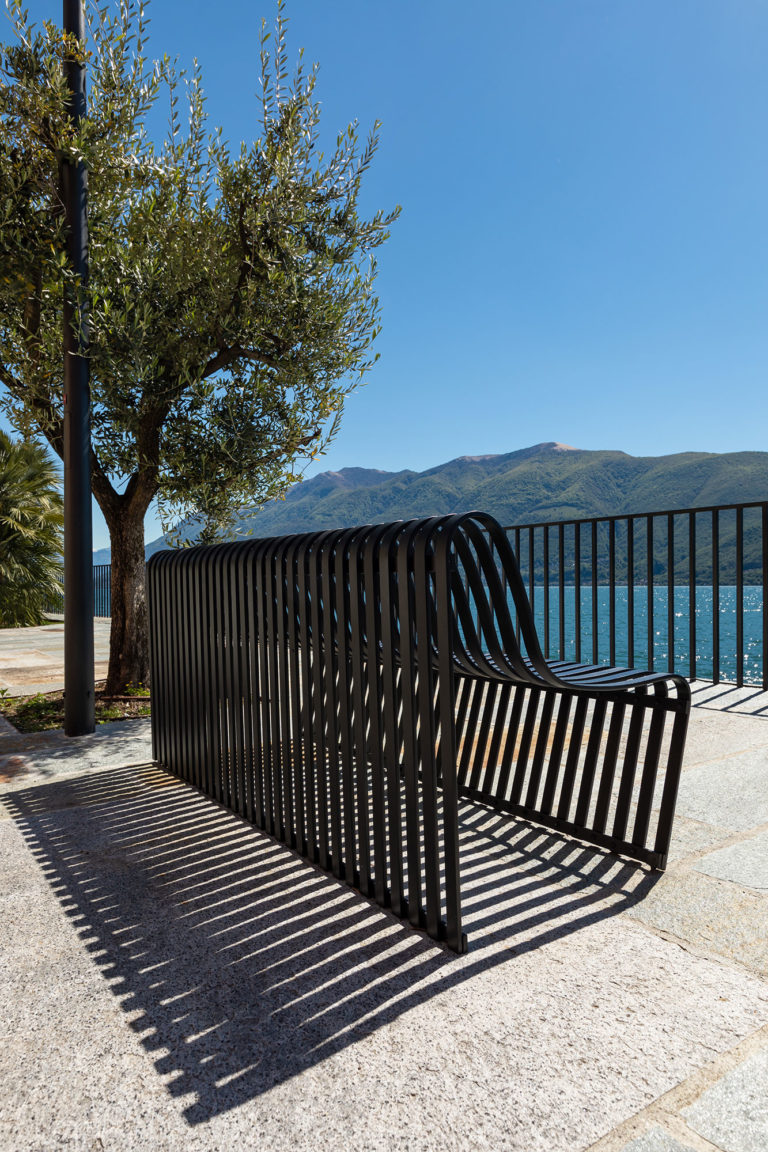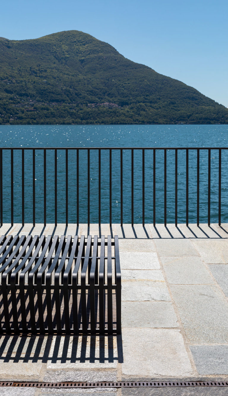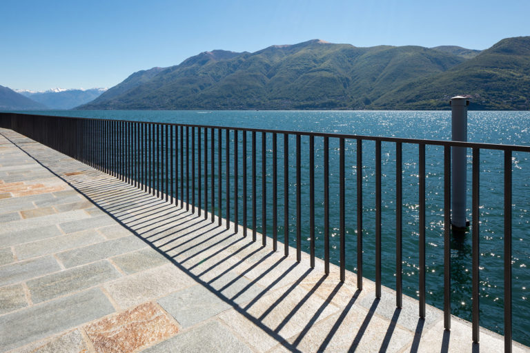 La ringhiera a lago ha una presenza marcata e asciutta, che non s’impone tuttavia, ma coesiste in maniera garbata con la vista dell’ameno paesaggio lacustre del Lago Maggiore.