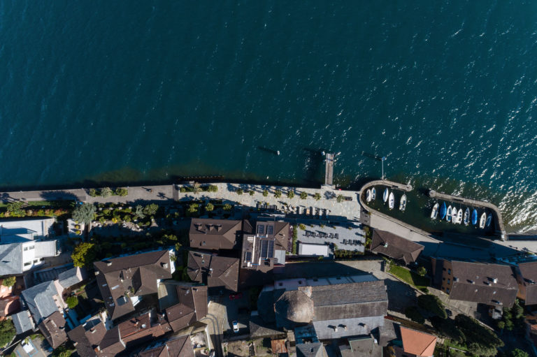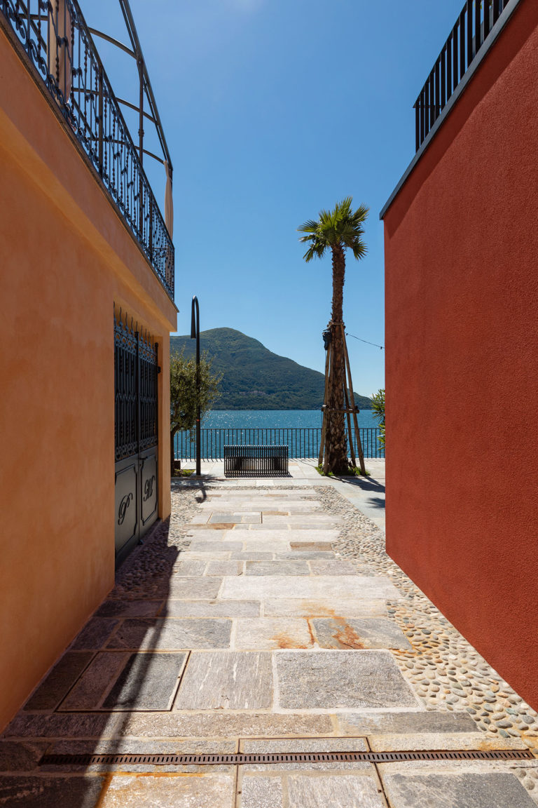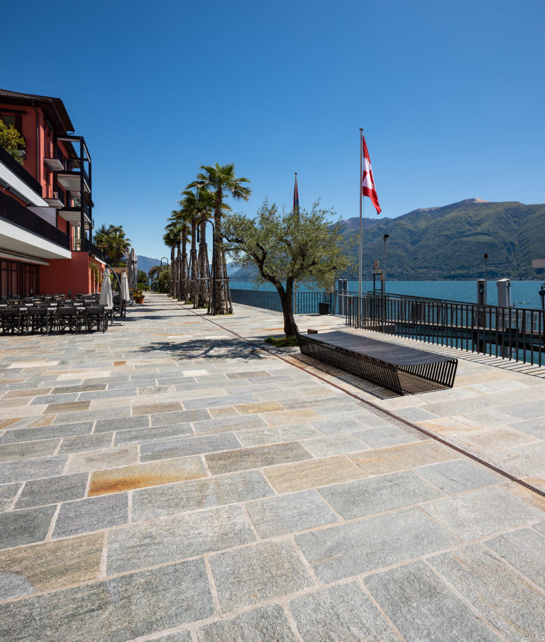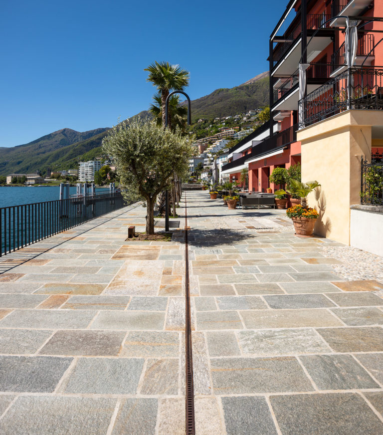 Si è preferito usare una pietra con marcata ossidazione e colorazione. Inoltre è stato fortunatamente ritrovato del materiale proveniente dalla demolizione della strada cantonale. Si è deciso di riusarlo per soluzioni di dettaglio, come ad esempio la canaletta di raccolta delle acque piovane oppure per l’innesto della pavimentazione sui percorsi che s’inerpicano dal lungolago verso il nucleo.