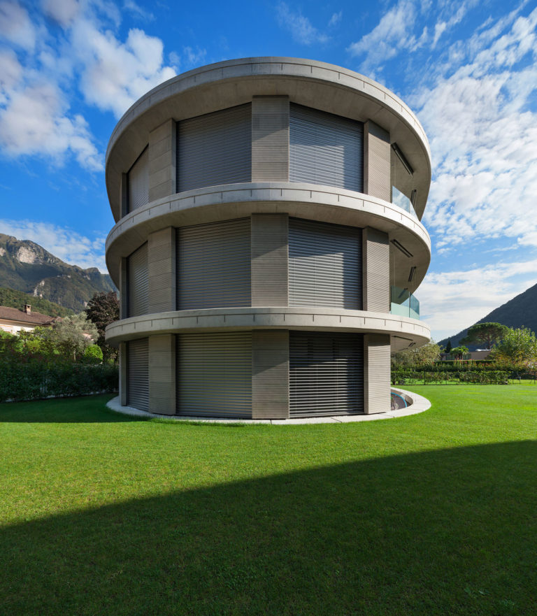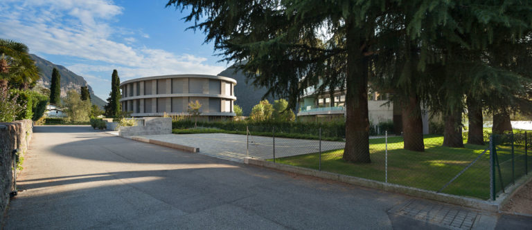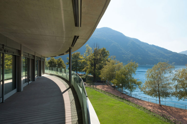La continuità di questi spazi è rafforzata dalla scelta della geometria dei volumi che offrono entrambi una pianta a forma ellittica di dimensioni diverse come due massi organici che dialogano con le forme sinuose del paesaggio lacustre. L’intervento si pone così come trait d’union tra il paese e il paesaggio lacustre.