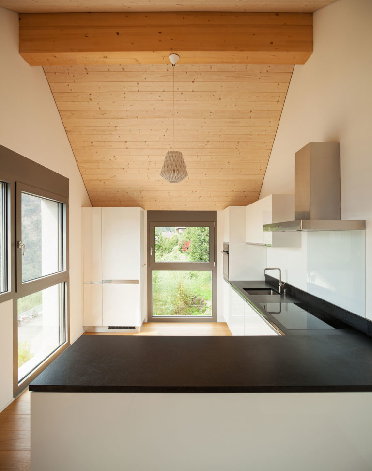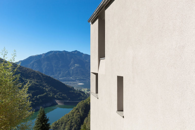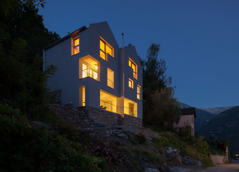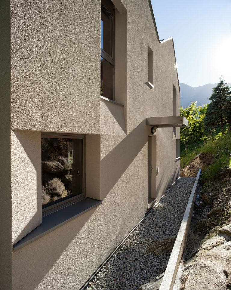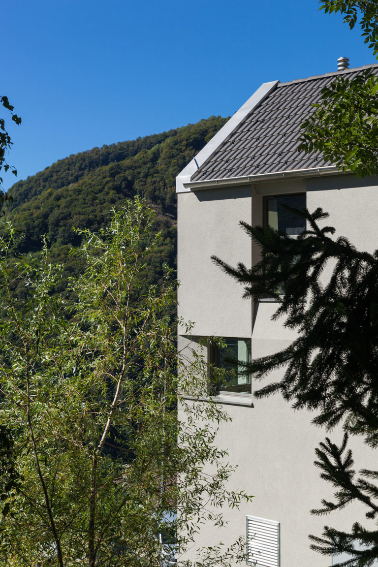 Le proporzioni del volume e la scelta di costruire su tre piani derivano dagli edifici tipici presenti in tutta la valle, consentendo l’inserimento in un paesaggio dominato da vecchi edifici verticali. Di conseguenza anche la suddivisione degli spazi interni segue la disposizione dei vecchi edifici della zona, con una leggera rotazione degli elementi come le scale e una parete centrale di contenimento.