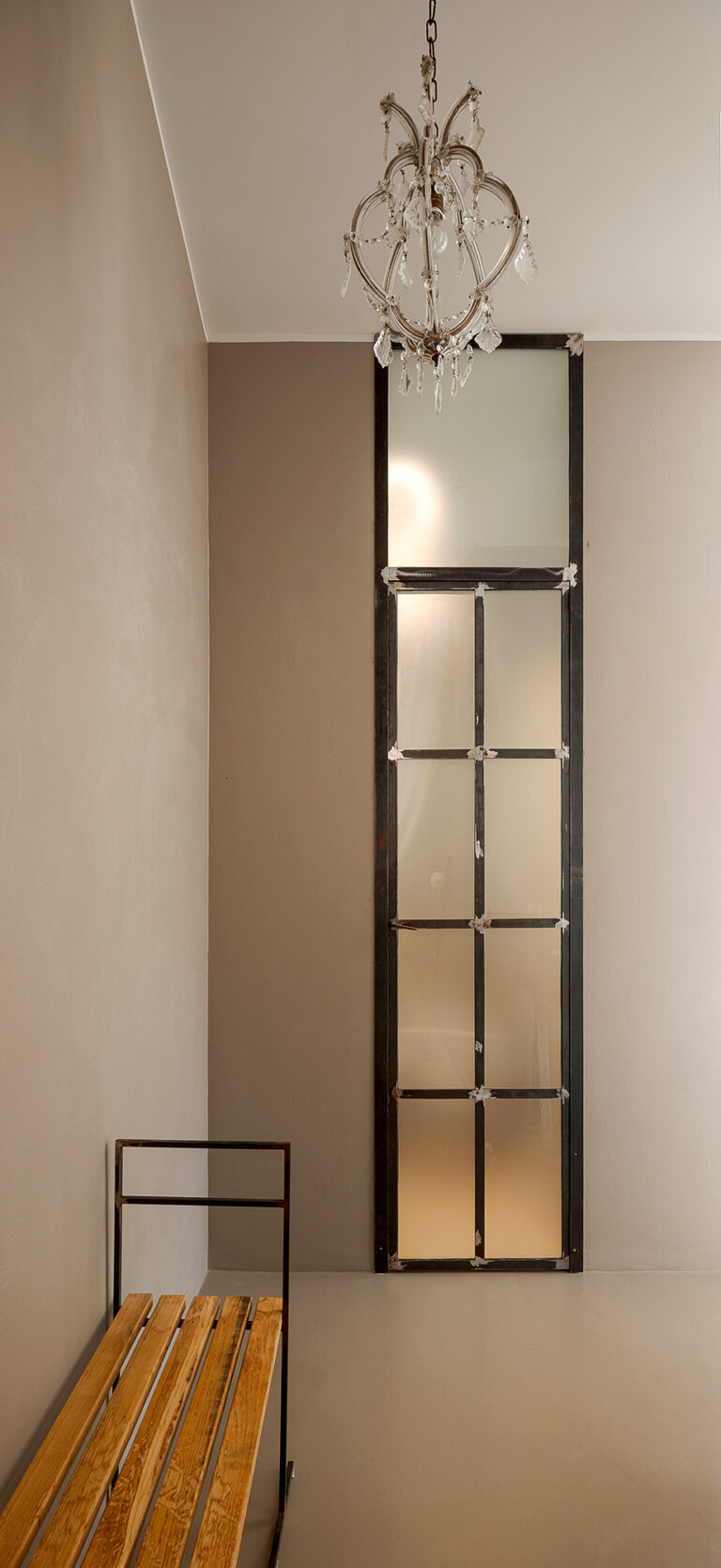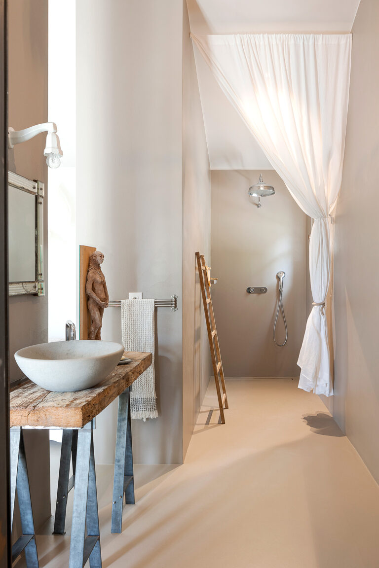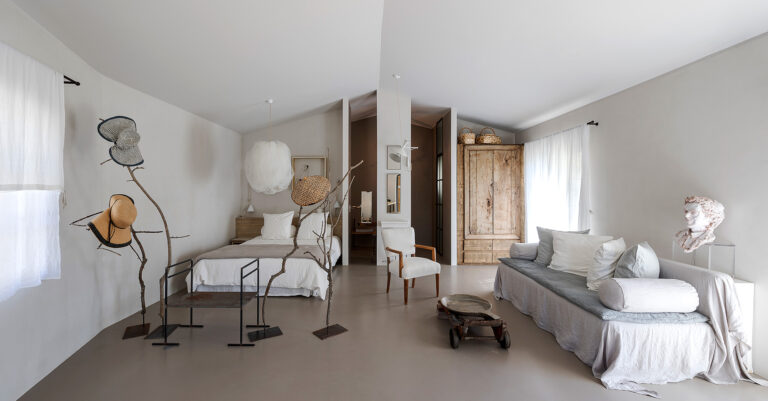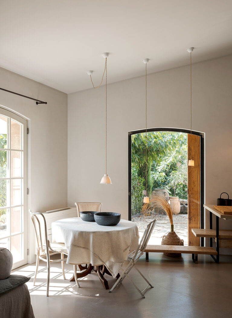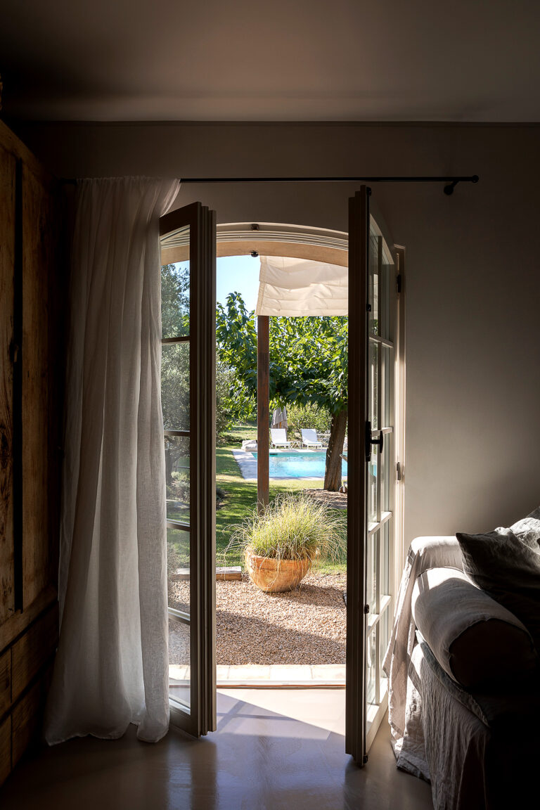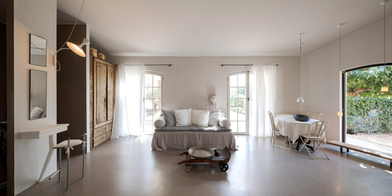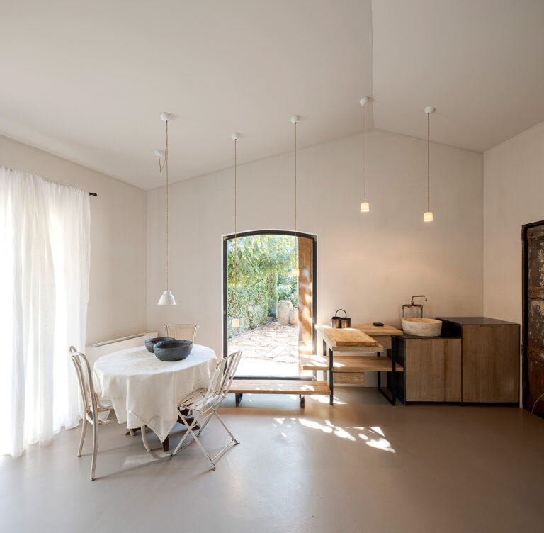 Uno spazio che indulge alla riflessione, a lasciare che il tempo scorra. Le grandi vetrate aperte sul giardino catturano la luce e i colori brillanti della campagna provenzale tanto cari agli impressionisti. All’interno un mobilio antico e minimalista al tempo stesso, dona forza e rigore all’autenticità bucolica della casa. La copertura disassata rispetto alla pianta crea quella dissonanza necessaria perchè si generi armonia ed equilibrio: la casa appare sospesa tra sogno e realtà.