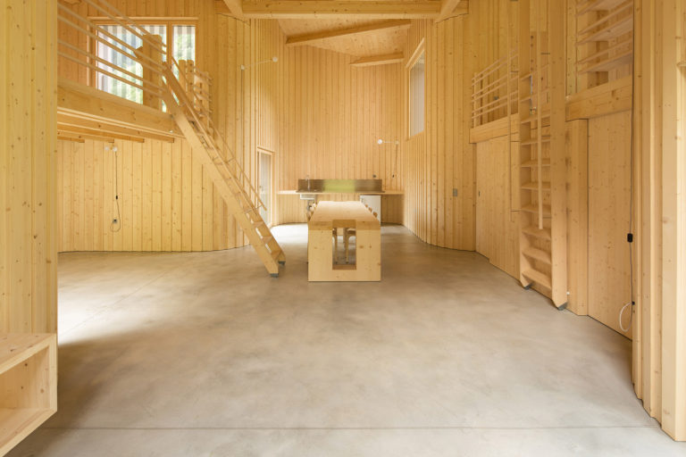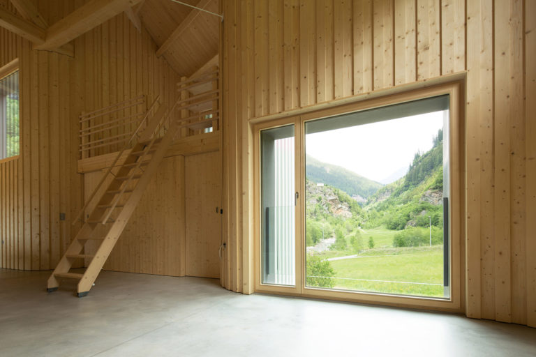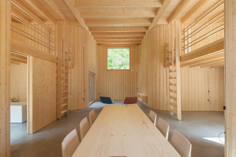 Le parti interrate sono in calcestruzzo armato, il volume superiore interamente in legno, senza interpretare la tipologia costruttiva tradizionale delle alpi, ma utilizzandola così com’è.