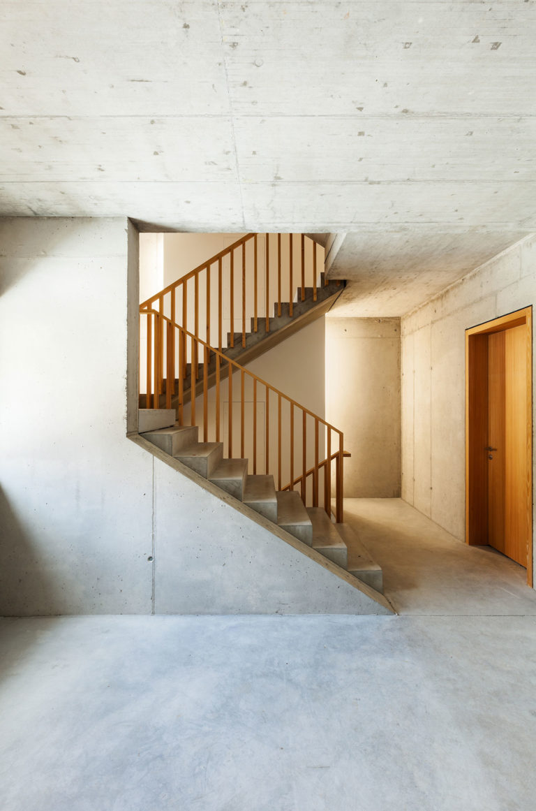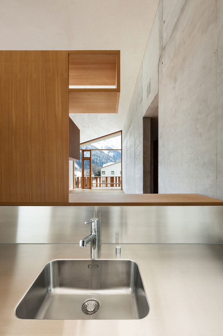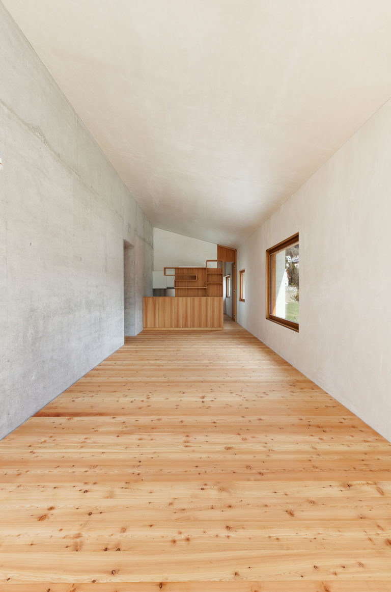 L’ampio soggiorno si orienta verso sud ed est, mentre le camere sono degli intimi nuclei di legno.